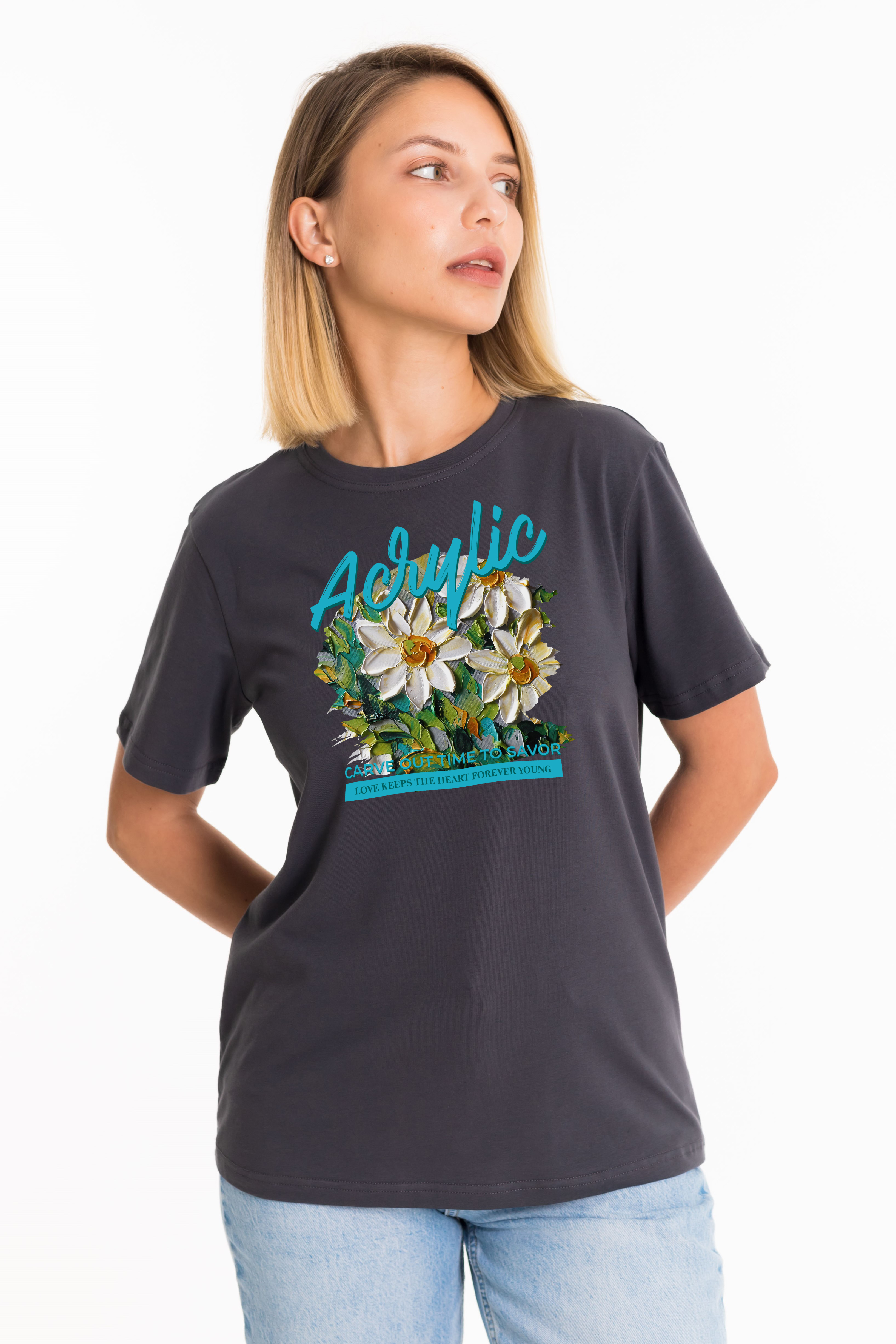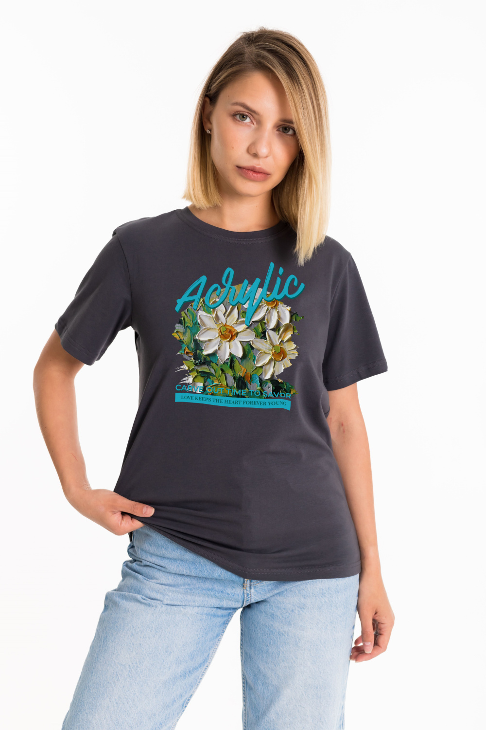 Женская футболка изготовлена из хлопкового полотна с добавлением лайкры, что обеспечивает комфорт и хорошую воздухопроницаемость. Футболка имеет короткий втачной рукав и круглый вырез горловины, что придает ей классический стильный вид. Такая модель серого цвета отлично сочетается с джинсами, брюками или юбкой. Изготовленная из натуральной ткани, футболка обеспечит комфорт в течение всего дня.