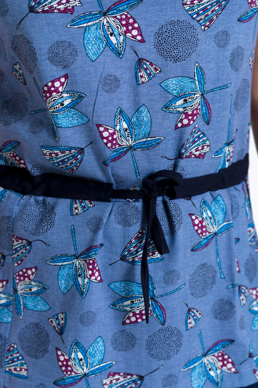 Домашняя футболка с коротким рукавом выполнена из натуральной хлопковой ткани. Цветочный рисунок приятно радует глаз. Футболка регулируется на поясе с помощью завязок, по бокам расположены карманы. Округлый вырез горловины и низ рукавов окантован бейкой.