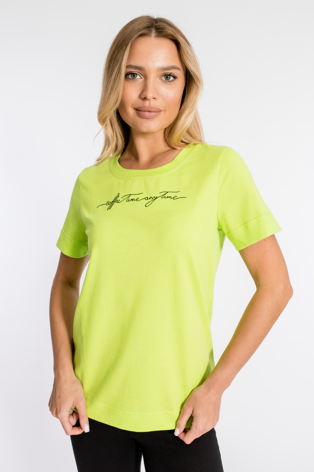 Футболка из кулирки, 100% хлопок, с коротким втачным рукавом и притачной планкой по горловине. Спереди вышивка.