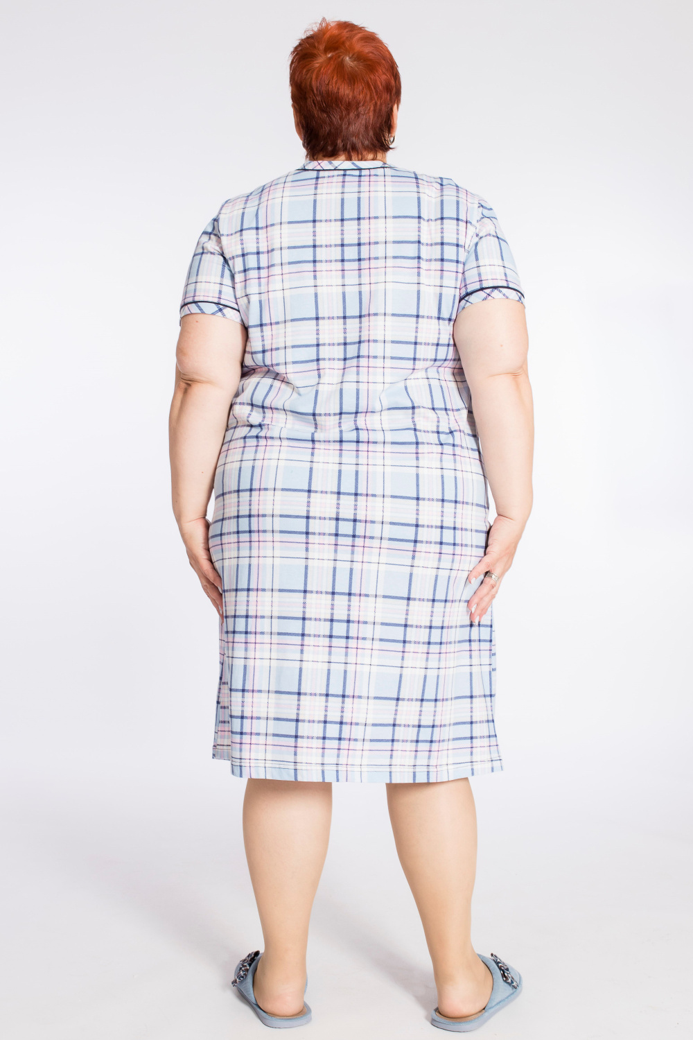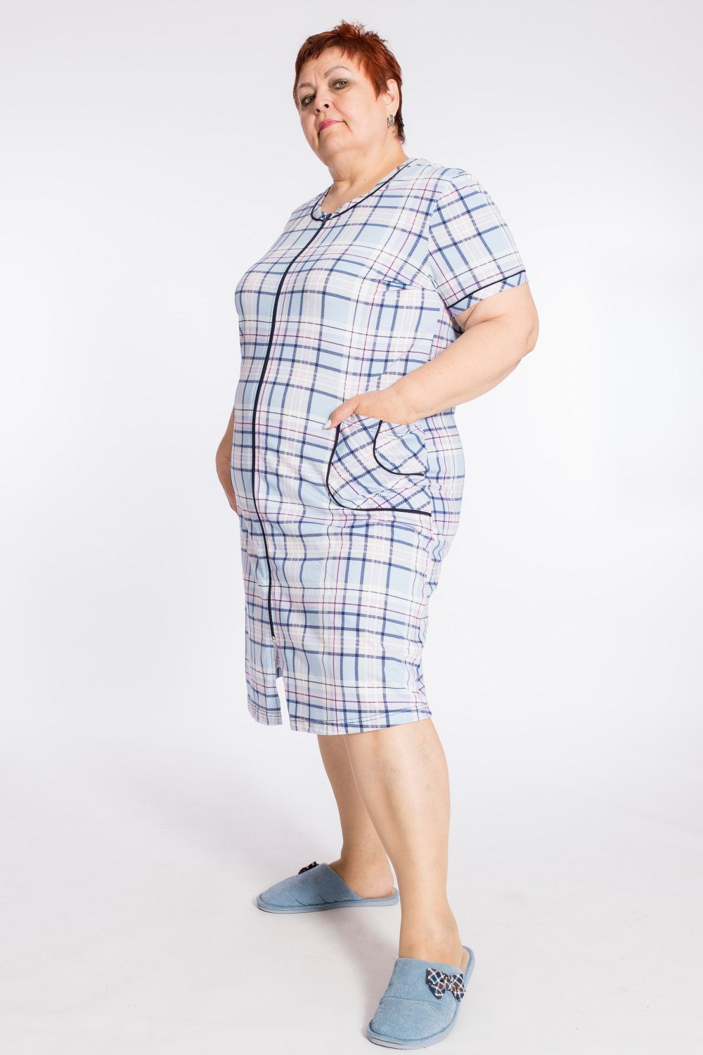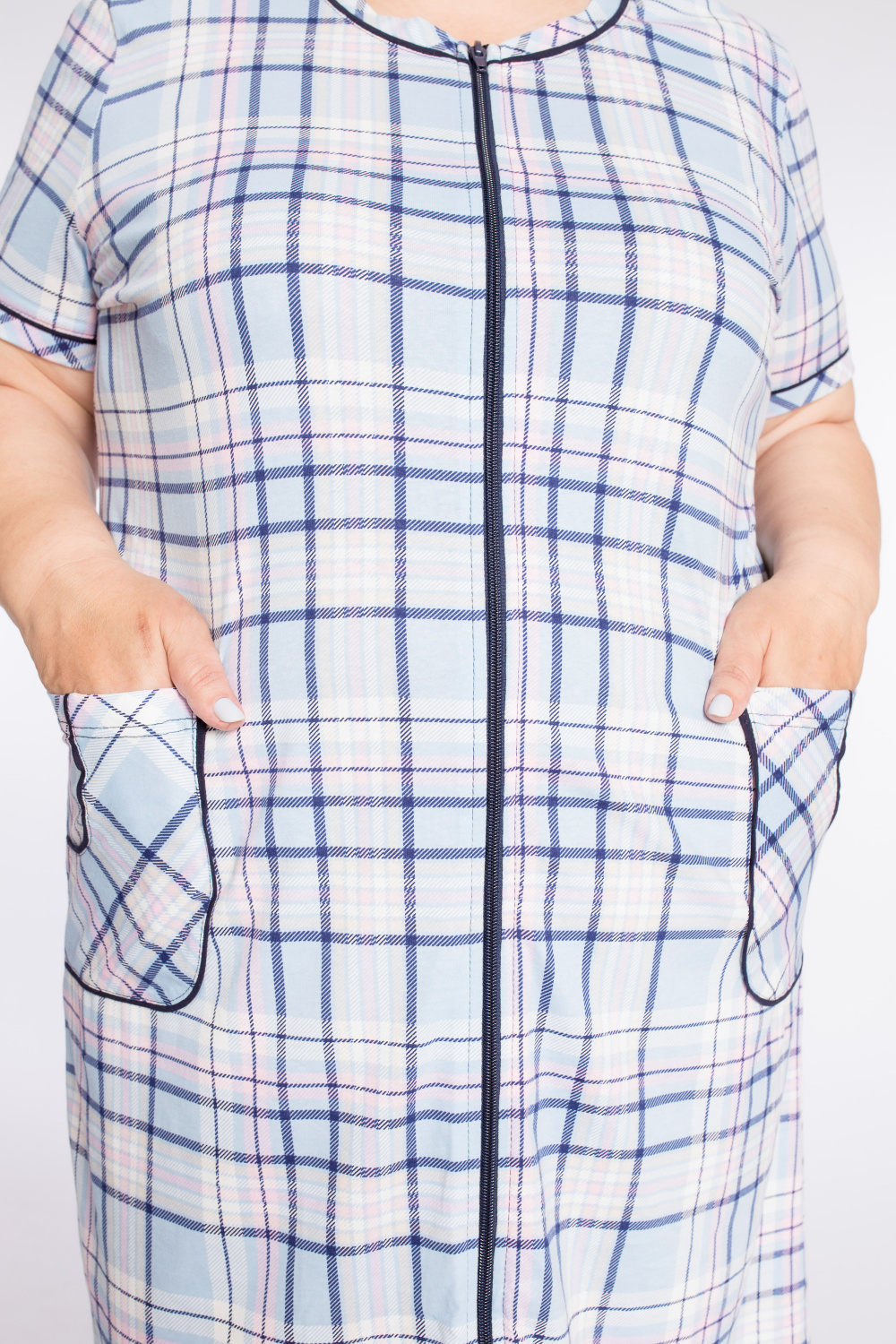 Халат с застёжкой на молнию выполнен из кулирки, 100% хлопок. Рукава короткие, спереди два накладных кармана. Вырез горловины, низ рукавов и карманы украшены отделочным кантом.