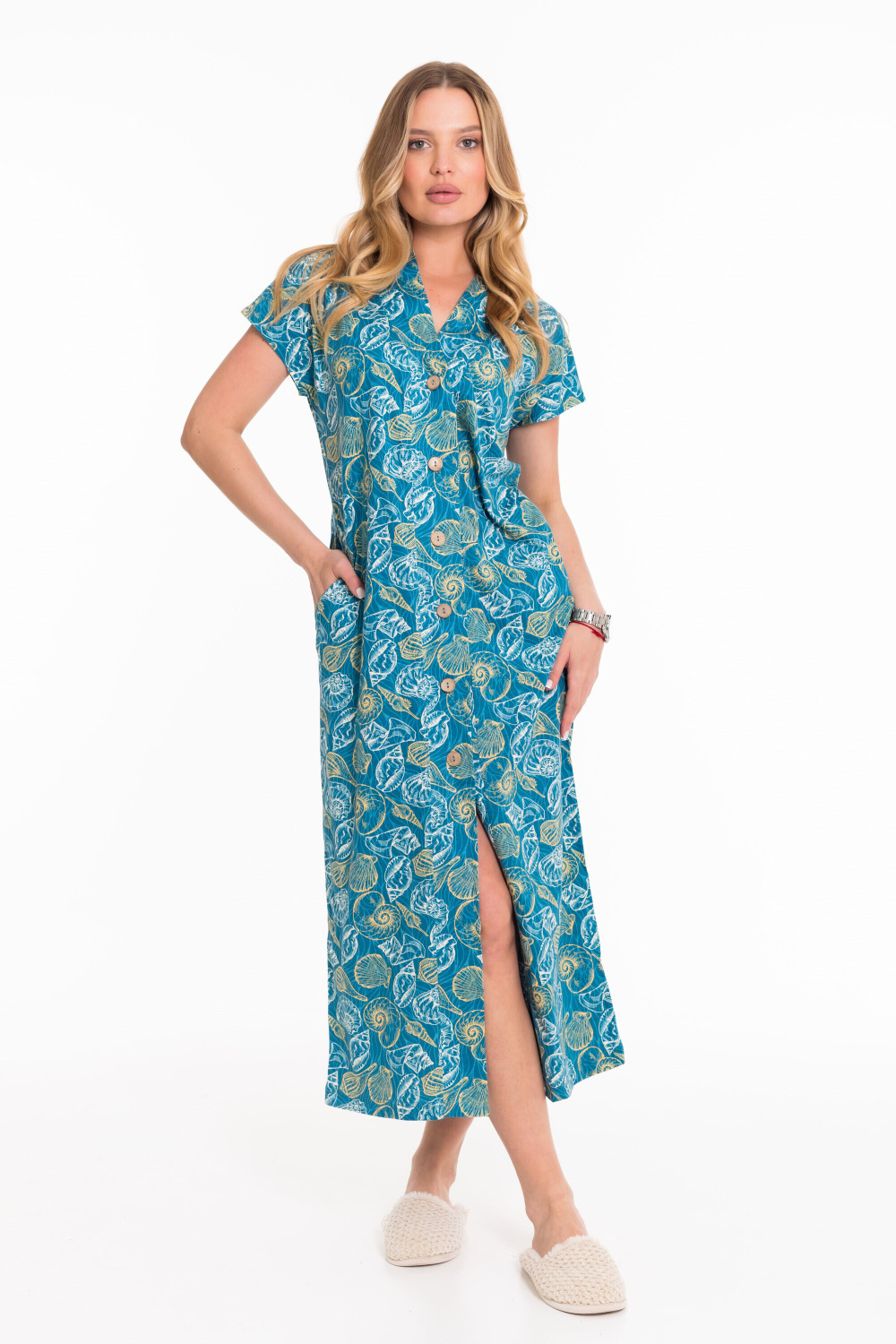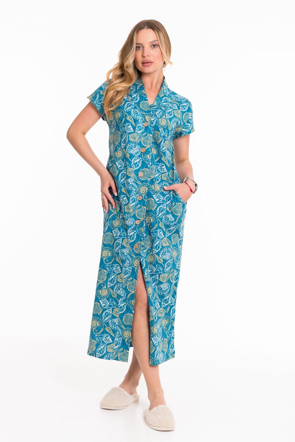 Халат выполнен из кулирки с набивным рисунком. Линия плеча спущена. Модель халата удлинённая, спереди застёгивается на пуговицы. Халат с карманами по бокам.