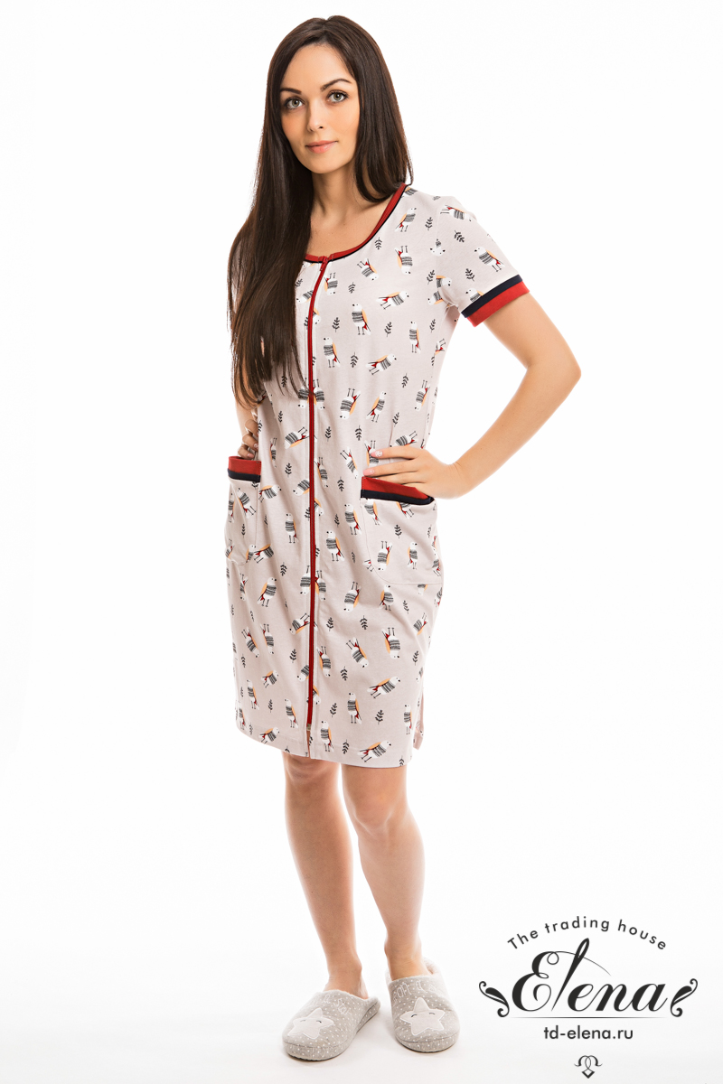 Халат с застёжкой на молнию выполнен из х/б полотна с набивным рисунком. Спереди накладные карманы. Горловина обработана бейкой с кантом, низ рукавов и верх карманов украшены двойными планками из отделочного полотна.