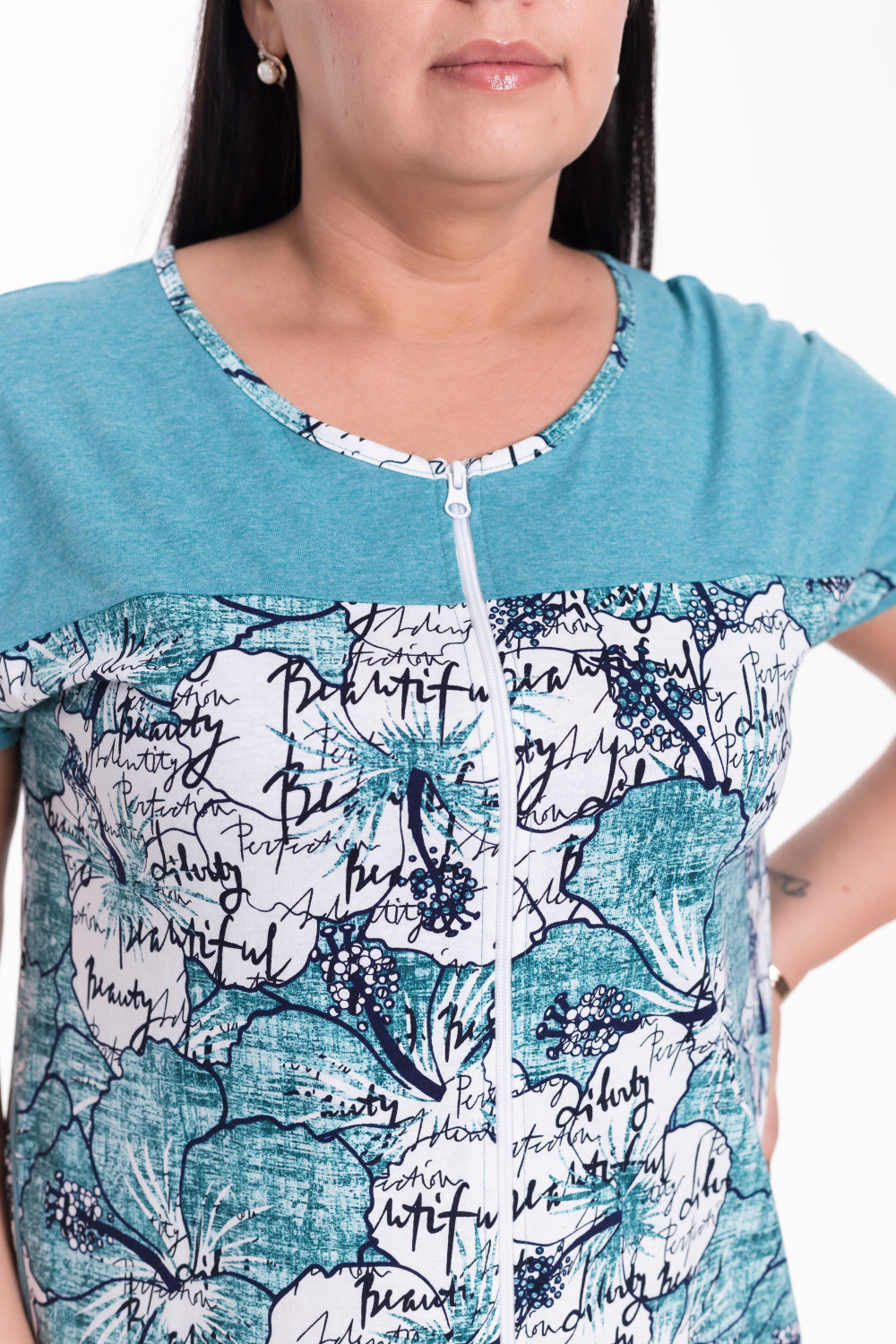 Халат для женщин выполнен из хлопкового полотна двух цветов-компаньонов. Линия плеча спущена, горловина и вход в карманы обработаны бейкой, застежка на молнию.