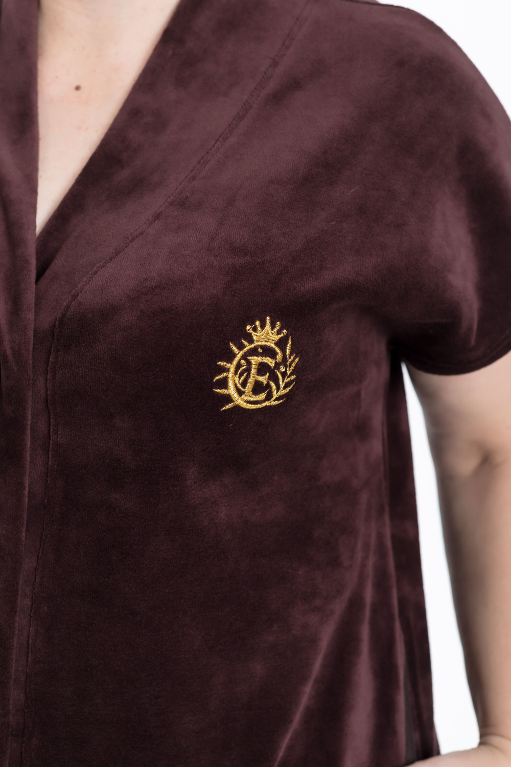 Женский халат — отличный выбор для домашнего отдыха. Халат выполнен из мягкого и приятного на ощупь однотонного велюра, который обеспечивает комфорт и тепло. Халат имеет свободный крой и застёгивается на пуговицы по всей длине. V-образный вырез горловины придаёт изделию стильный вид, с левой стороны расположена вышивка, которая добавляет изюминку в дизайн. Боковые карманы придают модели оригинальность. Такой халат станет отличным выбором одежды для дома.
