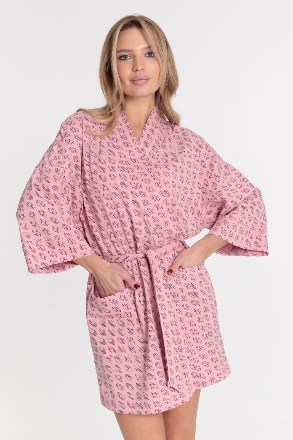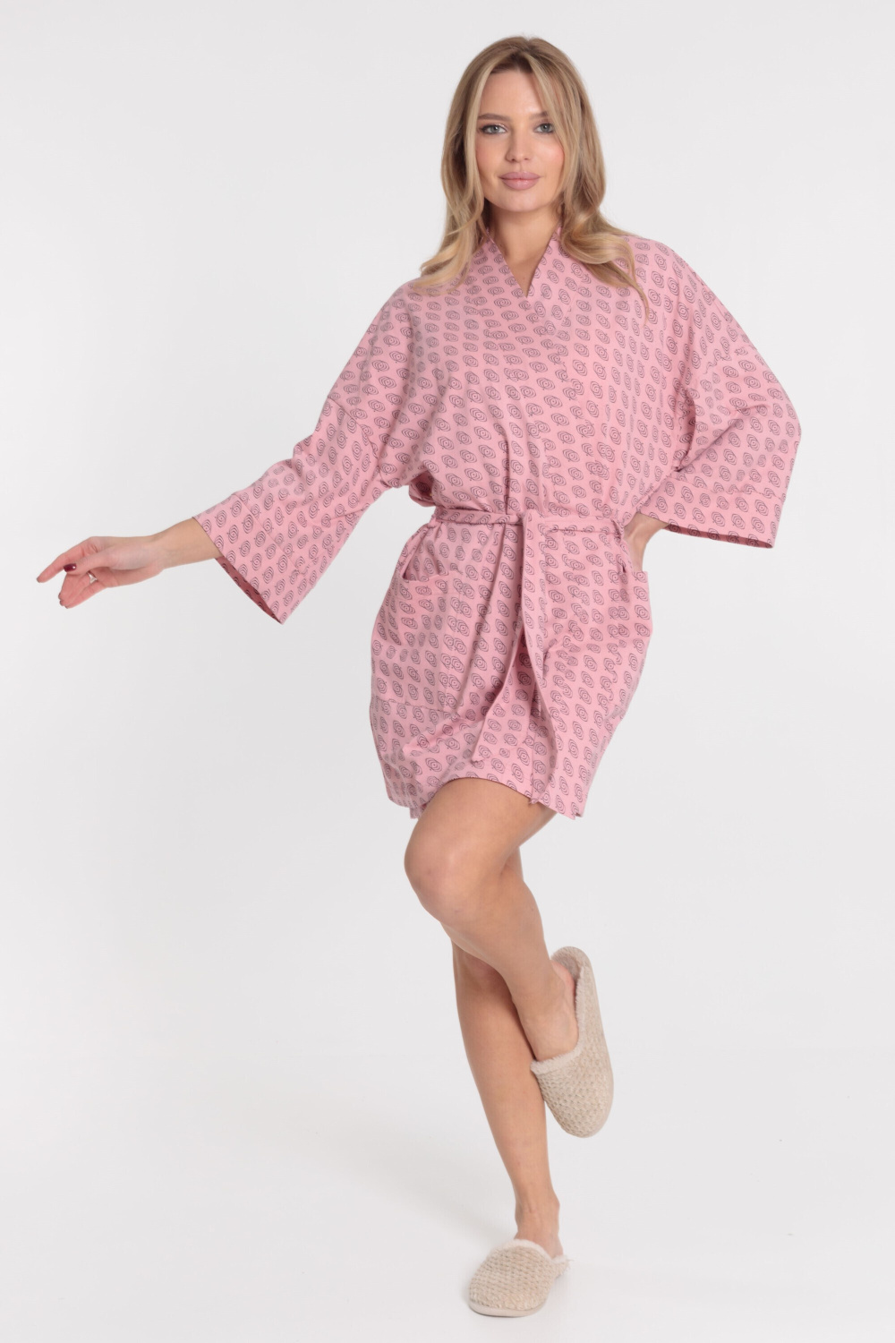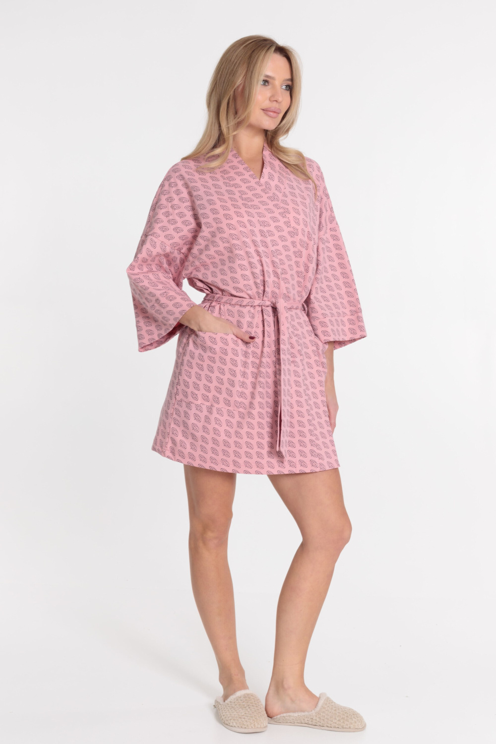 Женский халат на запах с поясом выполнен из кулирки, 100% хлопок. Свободный покрой даёт идеальную посадку на любую фигуру. Рукава широкие, линия плеча спущена, по бокам расположены два кармана.