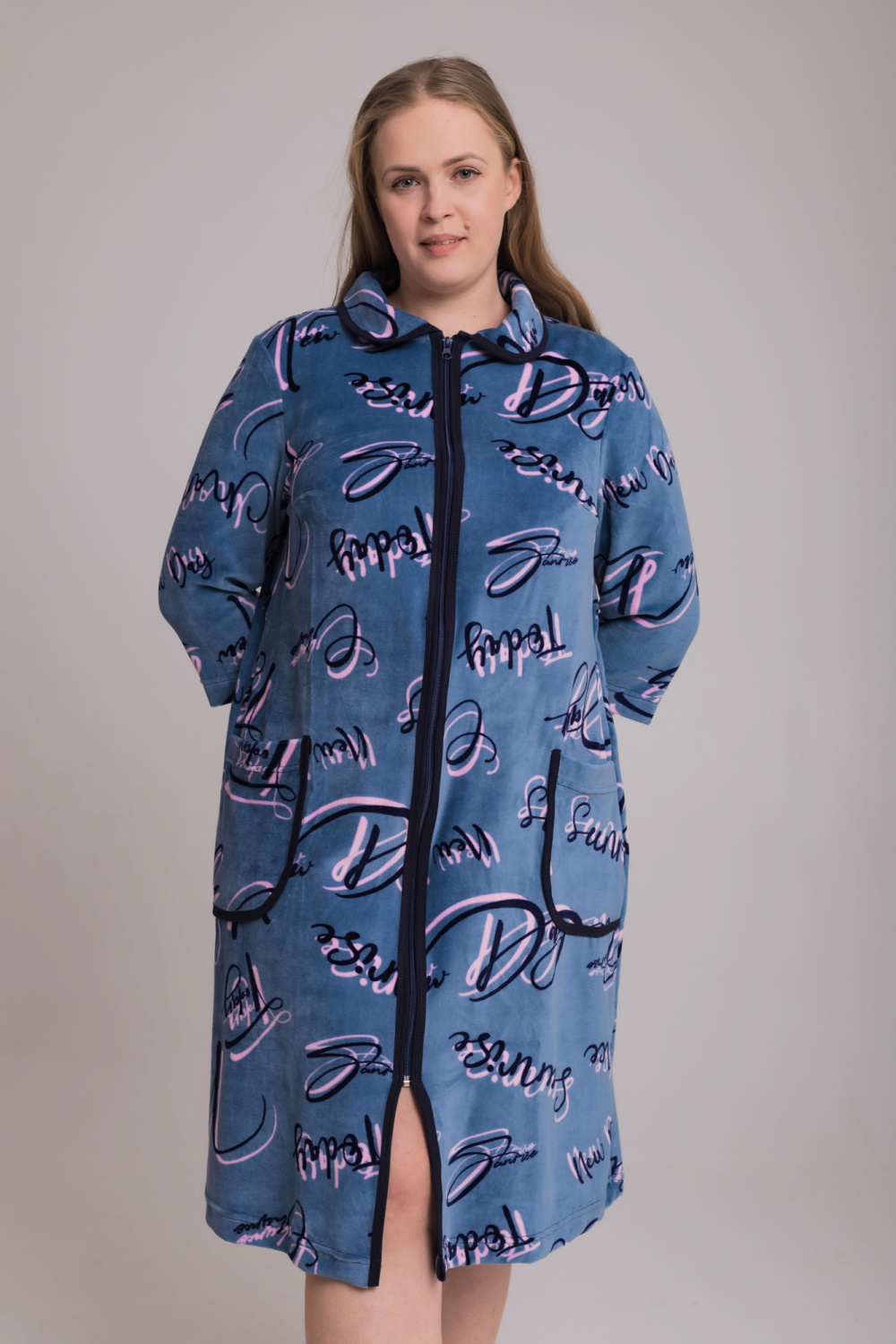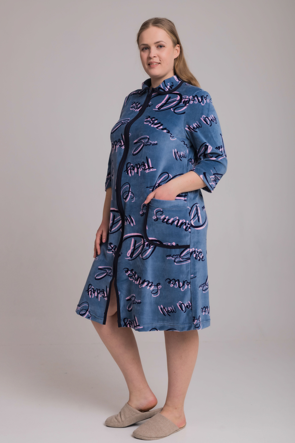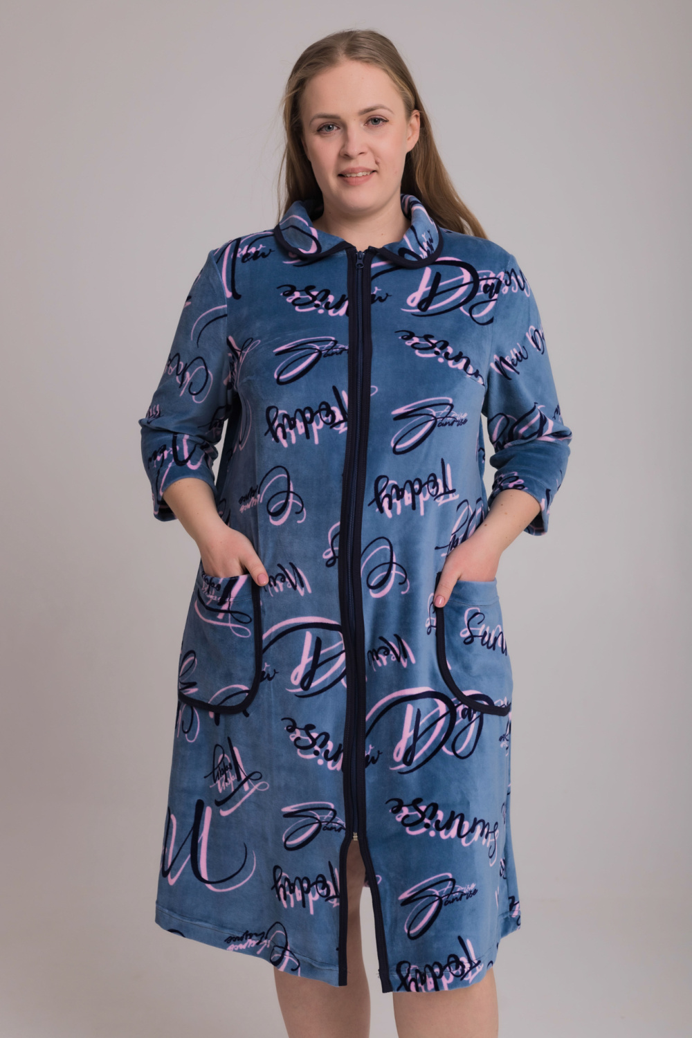 Халат с рукавами чуть длиннее локтя,застежка молния,