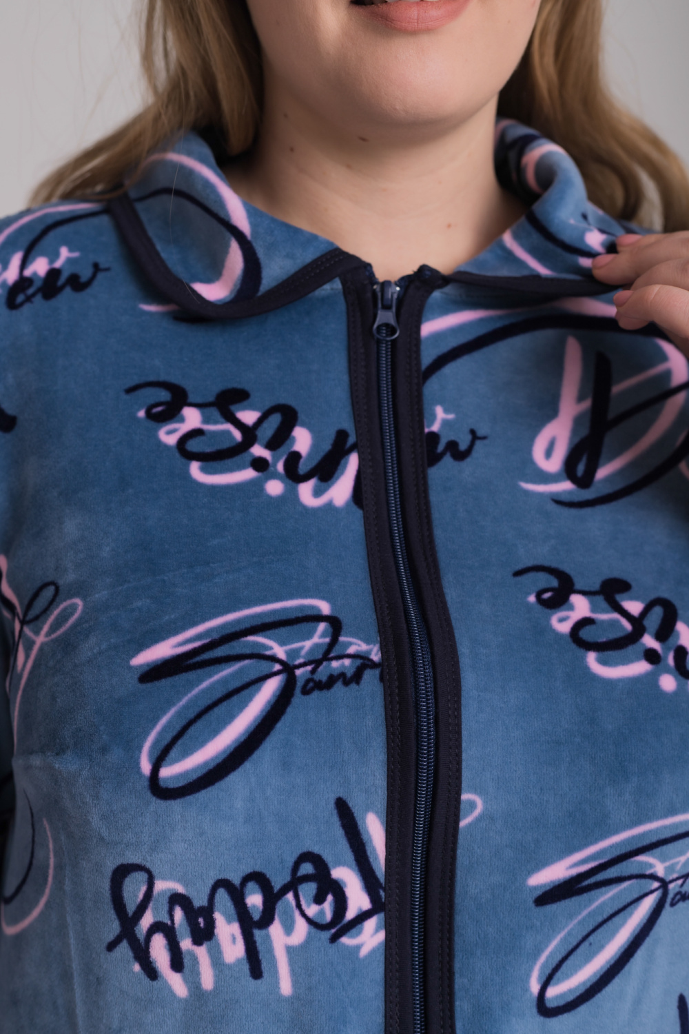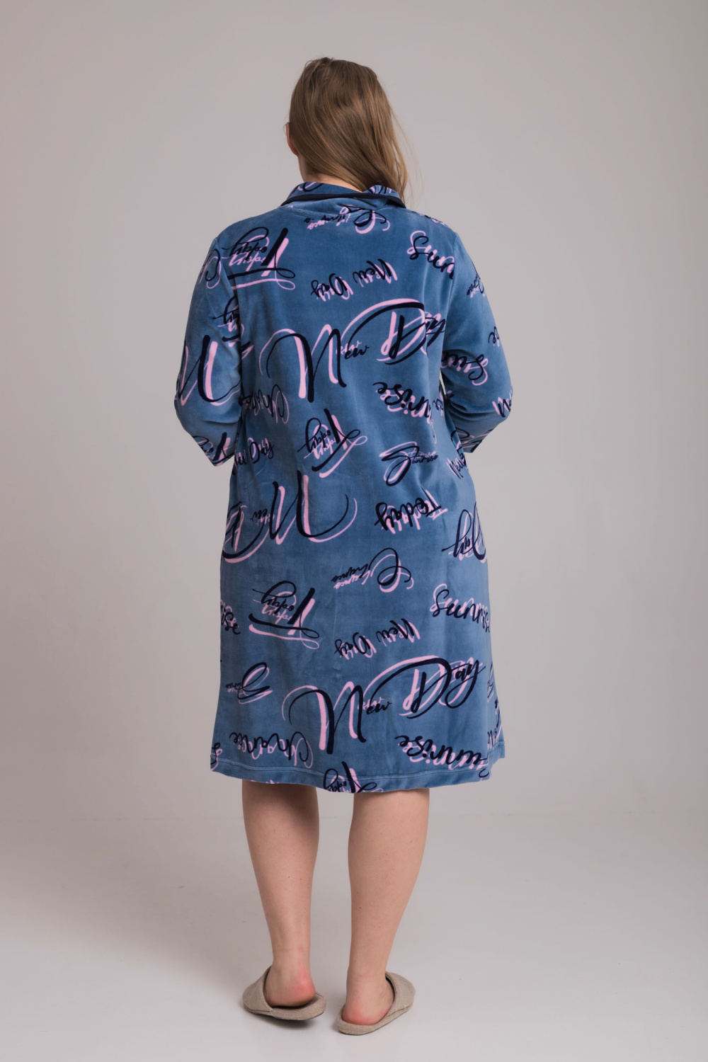 Халат выполнен из велюра с набивкой.