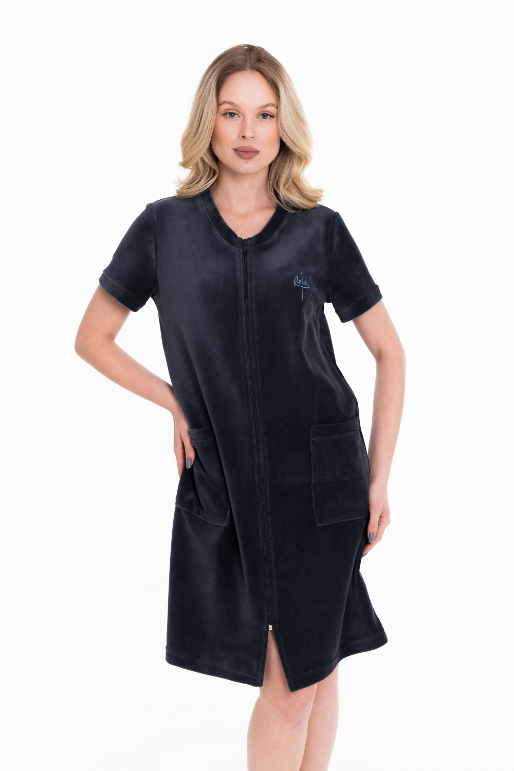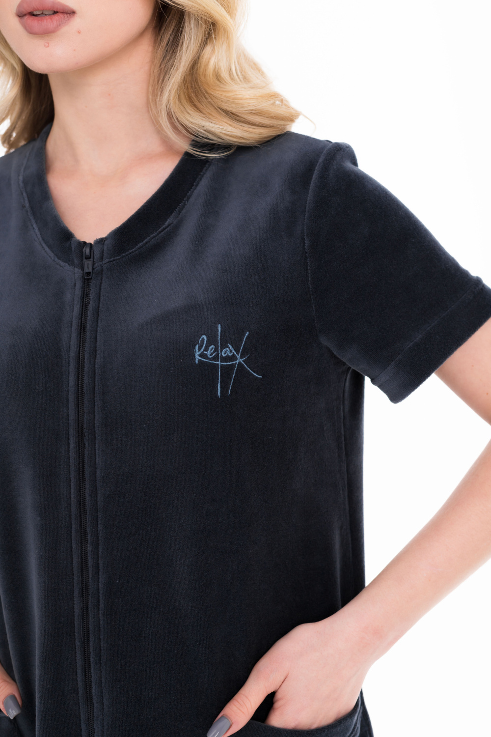Халат имеет прямой крой и застёгивается на замок. V-образный вырез горловины придаёт изделию стильный вид. Короткий рукав обеспечивает свободу движений.