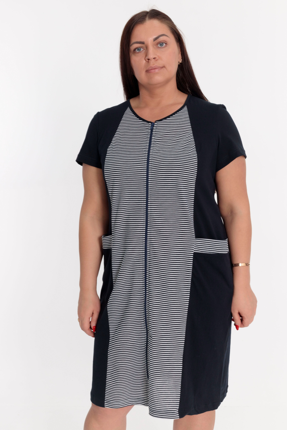 Халат выполнен из кулирки, 100% хлопок. С короткими рукавами и центральной застёжкой на молнию. По бокам расположены два кармана. Круглый вырез горловины оформлен бейкой.