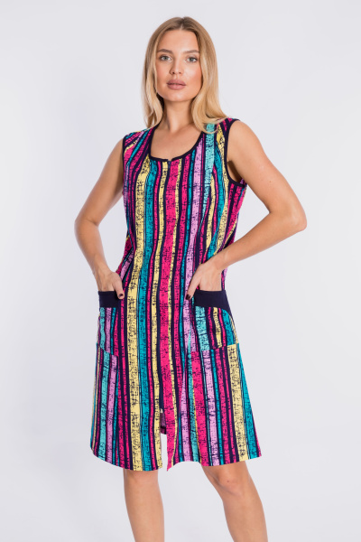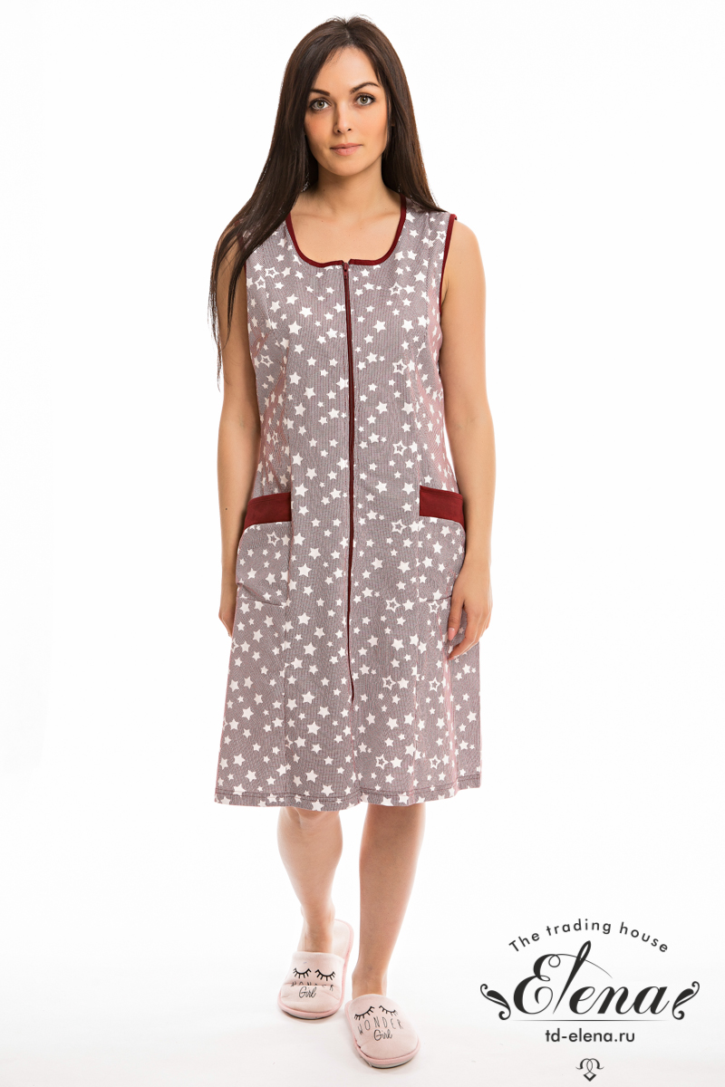 Халат без рукавов с центральной застёжкой на молнию. По бокам расположены два накладных кармана. Горловина, проймы и карманы обработаны бейкой из контрастного по цвету полотна.