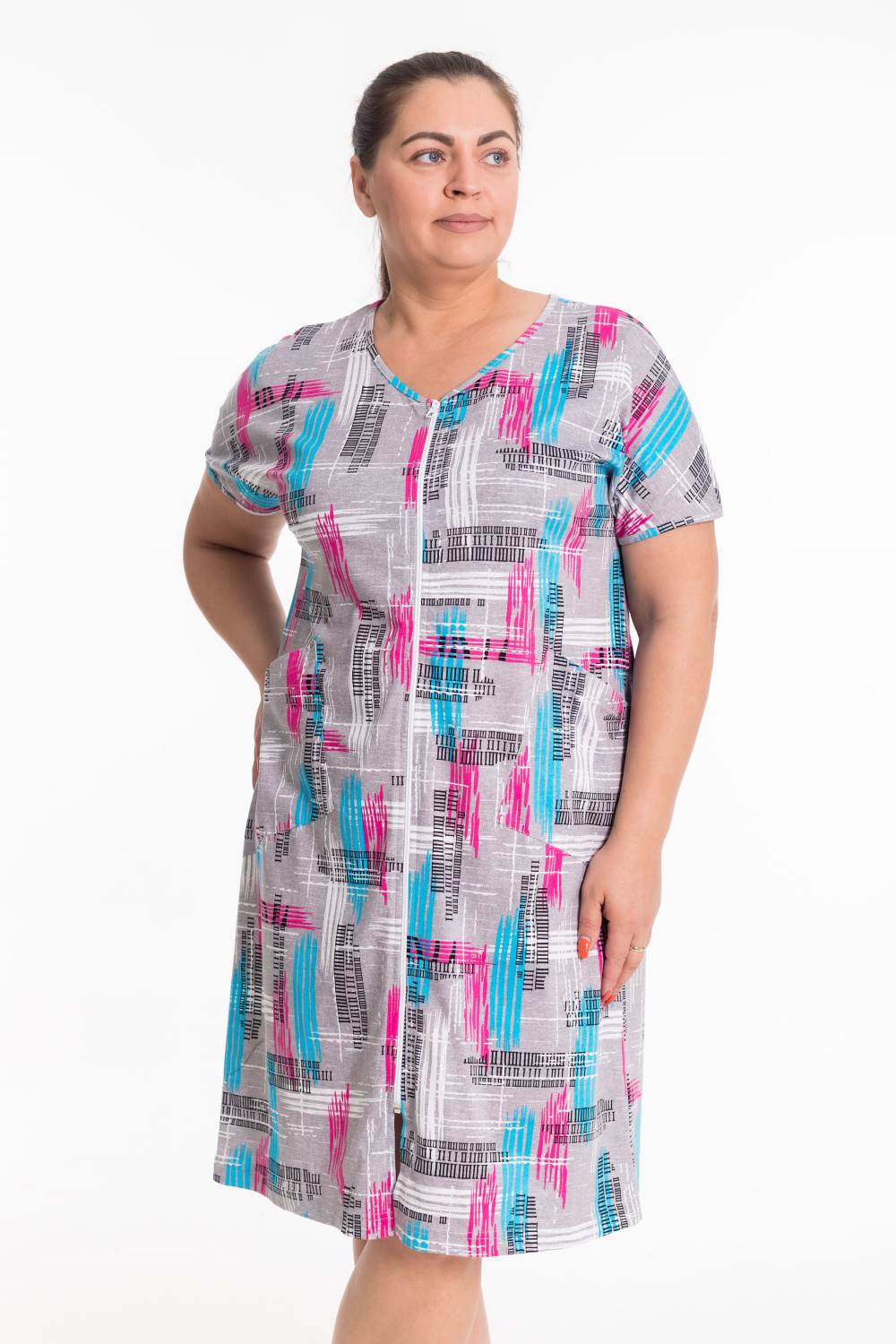 Женский халат — отличный выбор для домашнего отдыха. Он изготовлен из мягкого и комфортного хлопкового полотна с набивным рисунком, что придаёт изделию стильный вид. Халат застёгивается на молнию спереди, что обеспечивает удобство при надевании. Такой халат идеально подойдёт для повседневной носки дома.