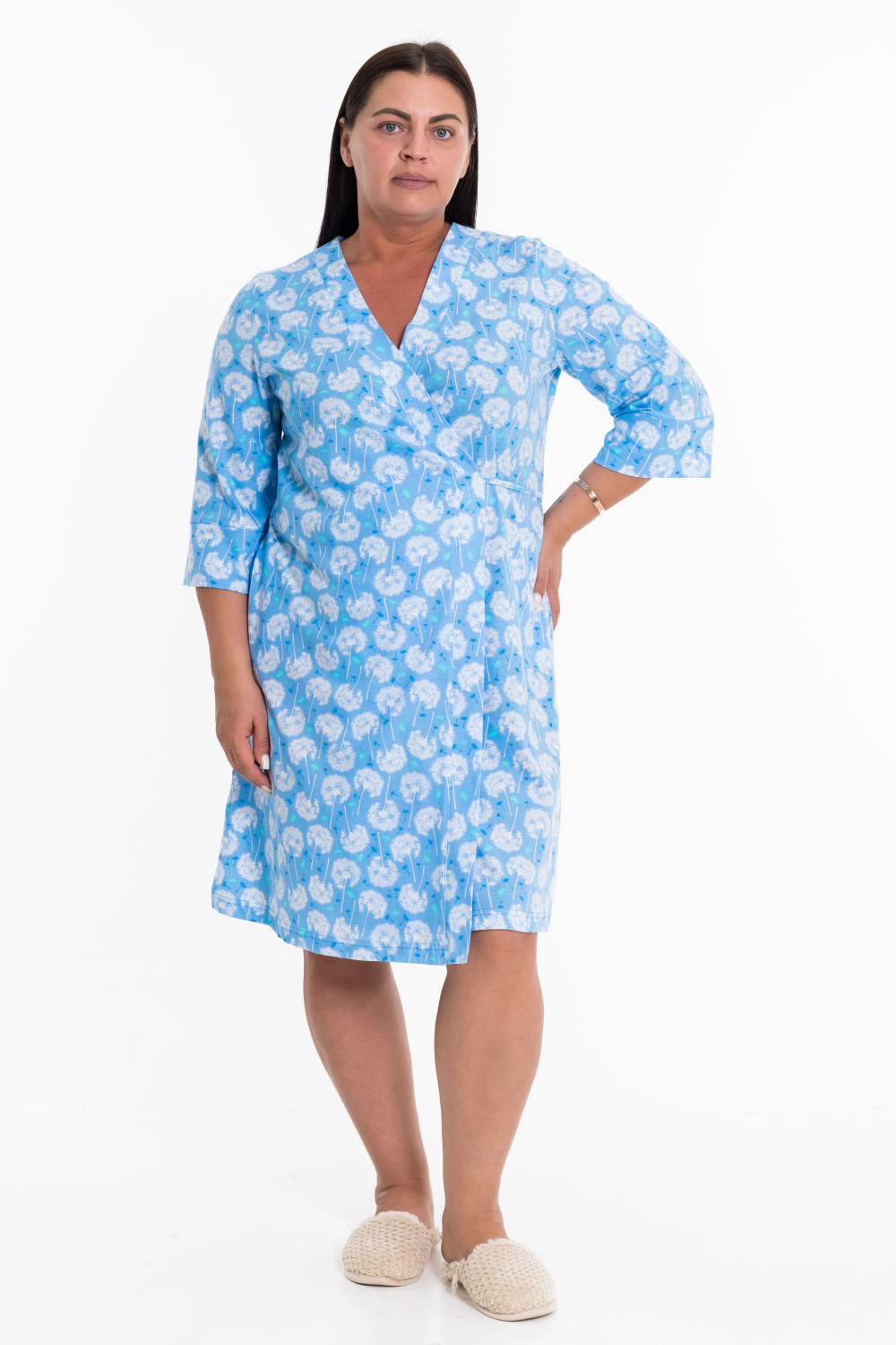 Халат выполнен из хлопкового полотна. Рукава длиной 3/4, полочки запахиваются и завязываются на пояс. По бокам есть карманы.