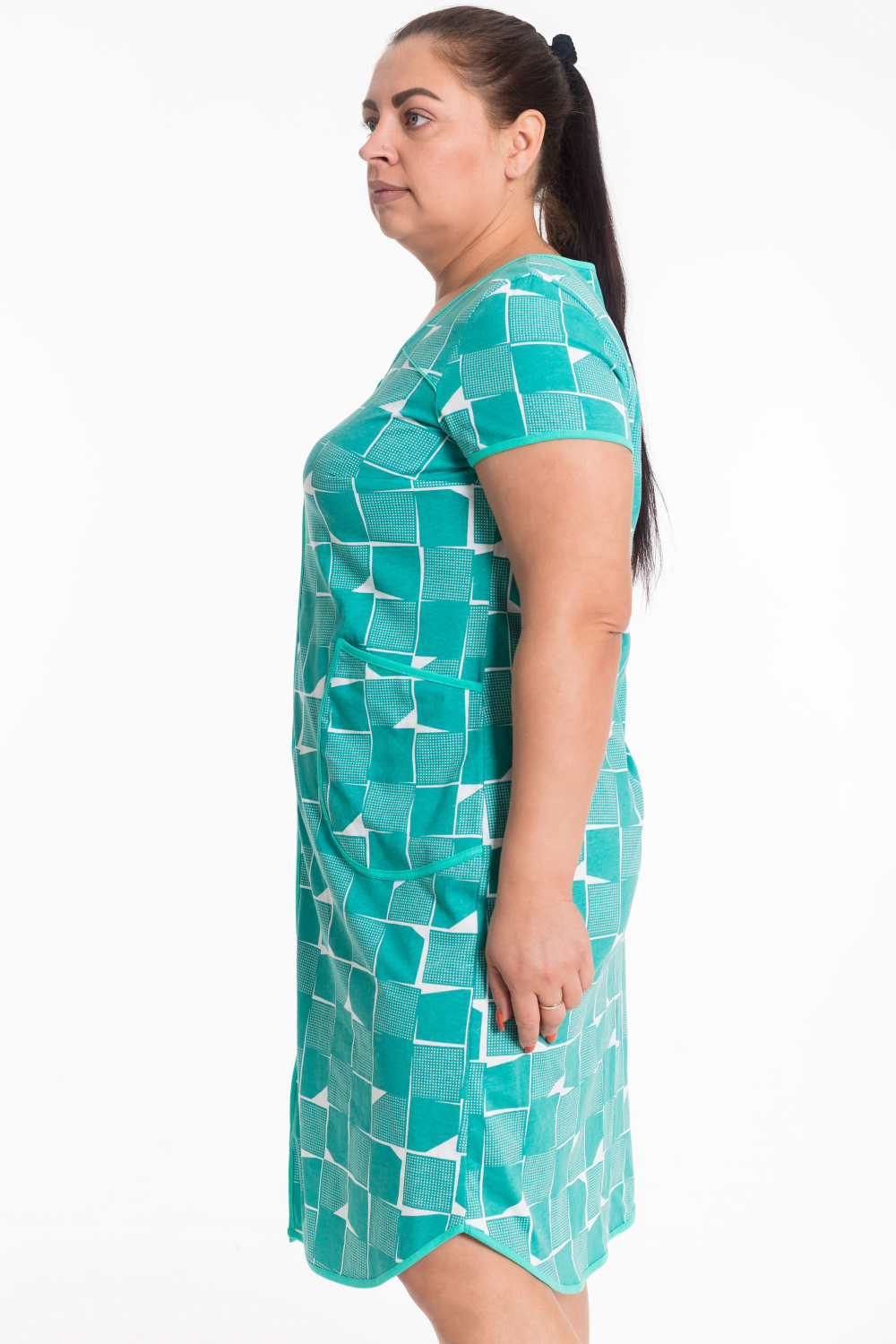 Халат с коротким рукавом выполнен из кулирки с набивкой. Центральная застёжка на молнию. Спереди расположены накладные карманы. Горловина, рукава, низ и борта халата обработаны отделочной бейкой.