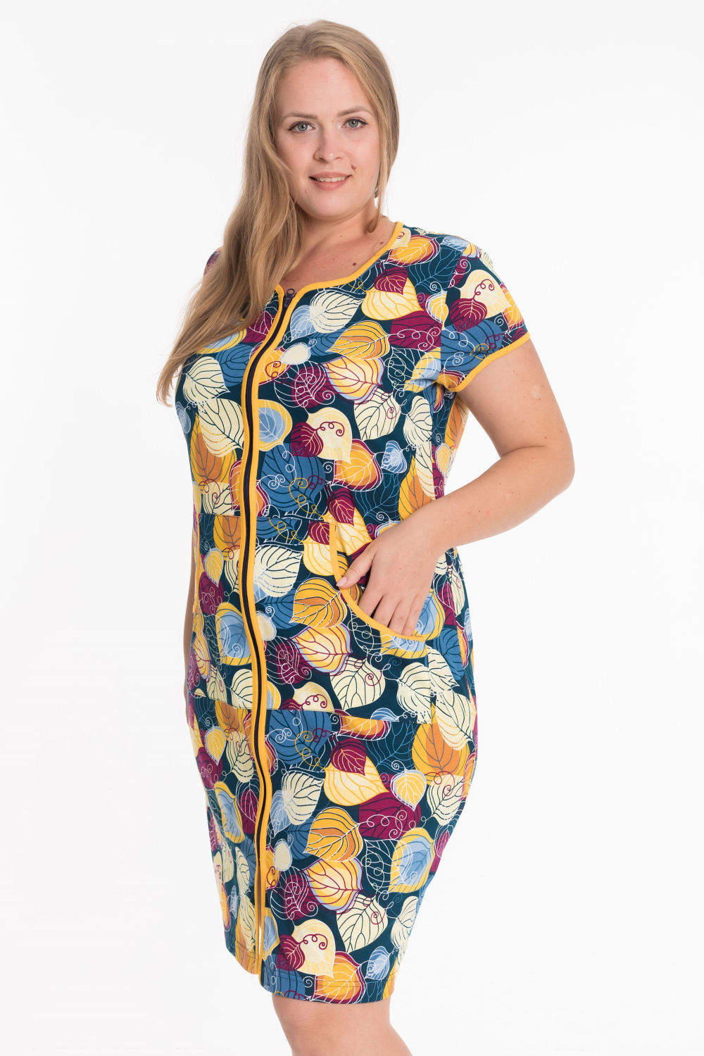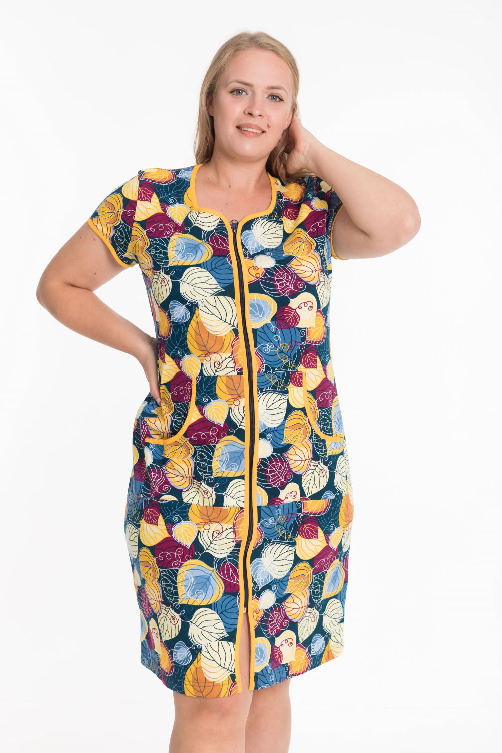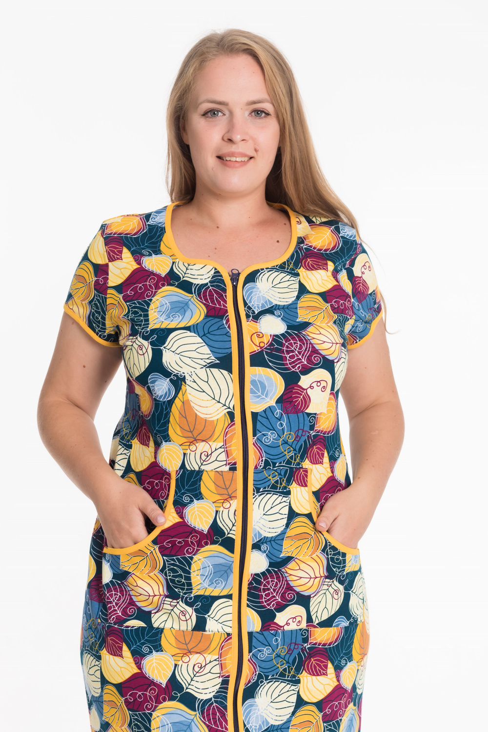 Женский халат — отличный выбор для домашнего отдыха. Он изготовлен из мягкого и комфортного хлопкового полотна с набивным рисунком, что придаёт изделию стильный вид. Халат застёгивается на молнию спереди, что обеспечивает удобство при надевании. Горловина, низ рукавов, борта и вход в карманы обработаны контрастной бейкой, что добавляет изделию аккуратности и завершает образ. Такой халат идеально подойдёт для повседневной носки дома.