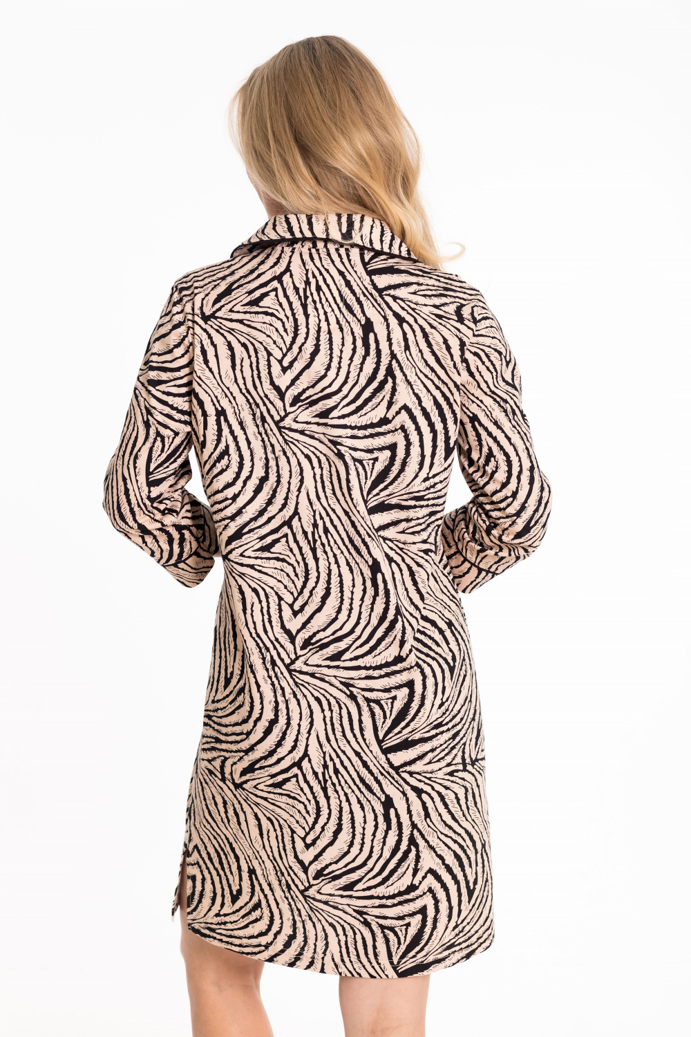 Халат выполнен из кулирки с набивным рисунком, 100% хлопок. Спереди халат застёгивается на пуговицы и дополнен аккуратным отложным воротником. Втачной рукав длиной 3/4 с манжетами. С левой стороны расположен нагрудный карман. Тёмный кант по краю воротника, бортам, манжетам и карману подчёркивает линии изделия и добавляет выразительности.