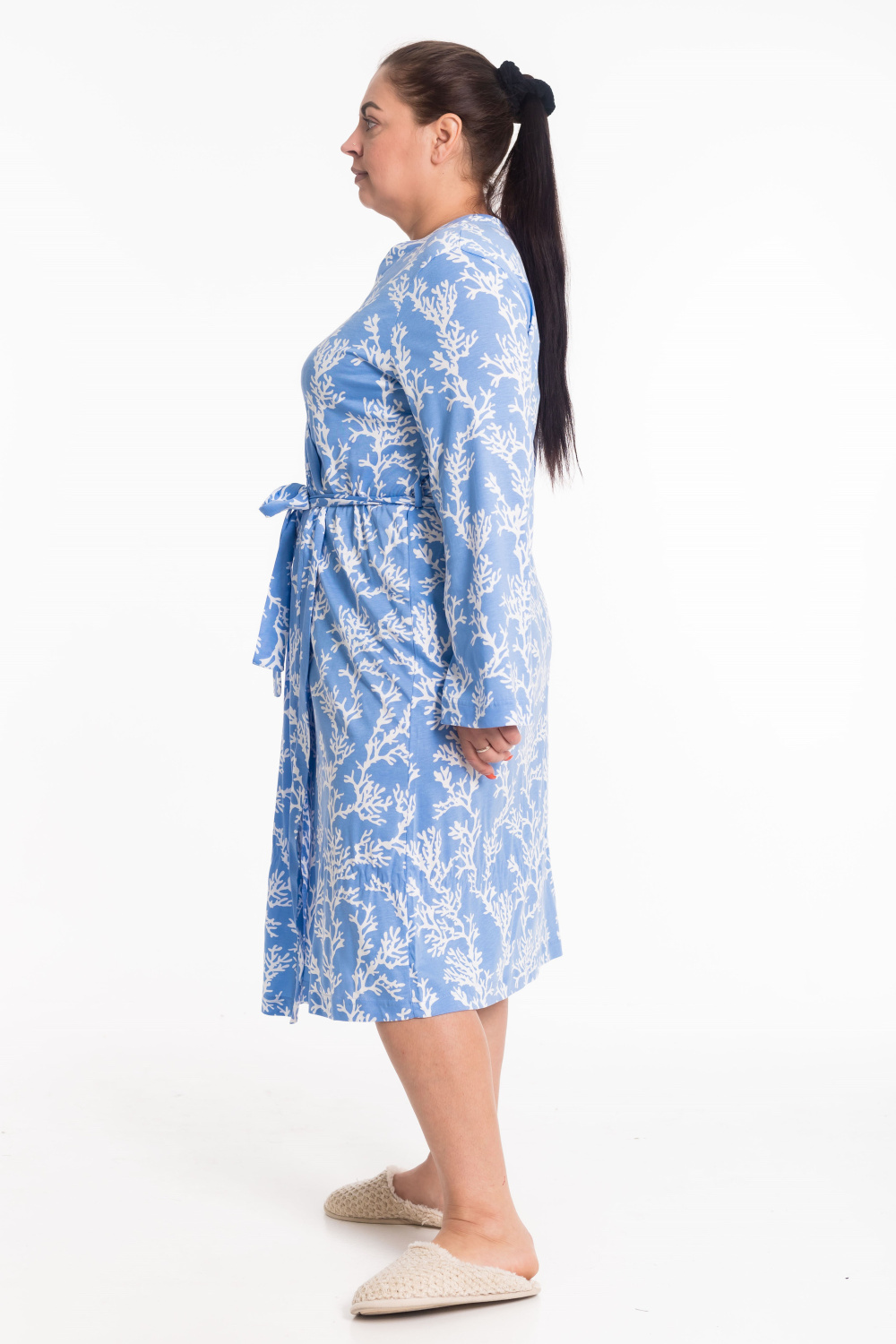 Халат женский выполнен из кулирки с набивным рисунком "кораллы". Модель на запах, без воротника, с аккуратной притачной планкой по борту. Рукава расклёшенные, что придаёт изделию лёгкость и женственность. В комплекте пояс, фиксирующийся на талии с помощью шлёвок, позволяющий удобно регулировать посадку.