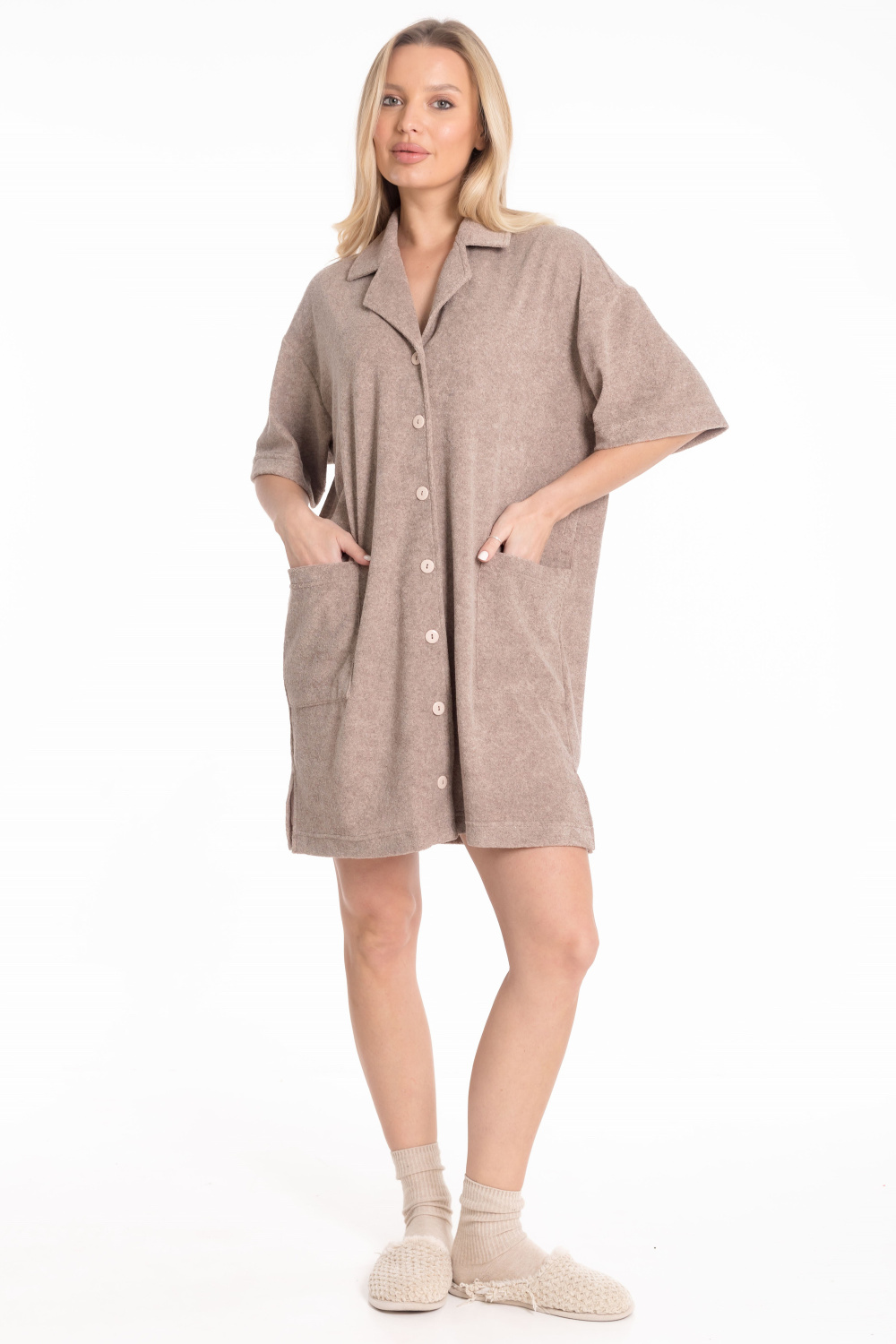 Женский халат — идеальный вариант для домашнего отдыха. Он выполнен из мягкой и приятной на ощупь махровой ткани, которая обеспечивает комфорт и тепло. Халат имеет прямой силуэт и спущенную линию плеча. Рукава доходят до локтя, обеспечивая удобство и свободу движений. Отложной воротник и застёжка на пуговицах делают халат стильным. Накладные карманы и разрезы по бокам добавляют изделию функциональности и оригинальности. Изготовленный из натуральной ткани, халат обеспечит комфорт в течение всего дня.