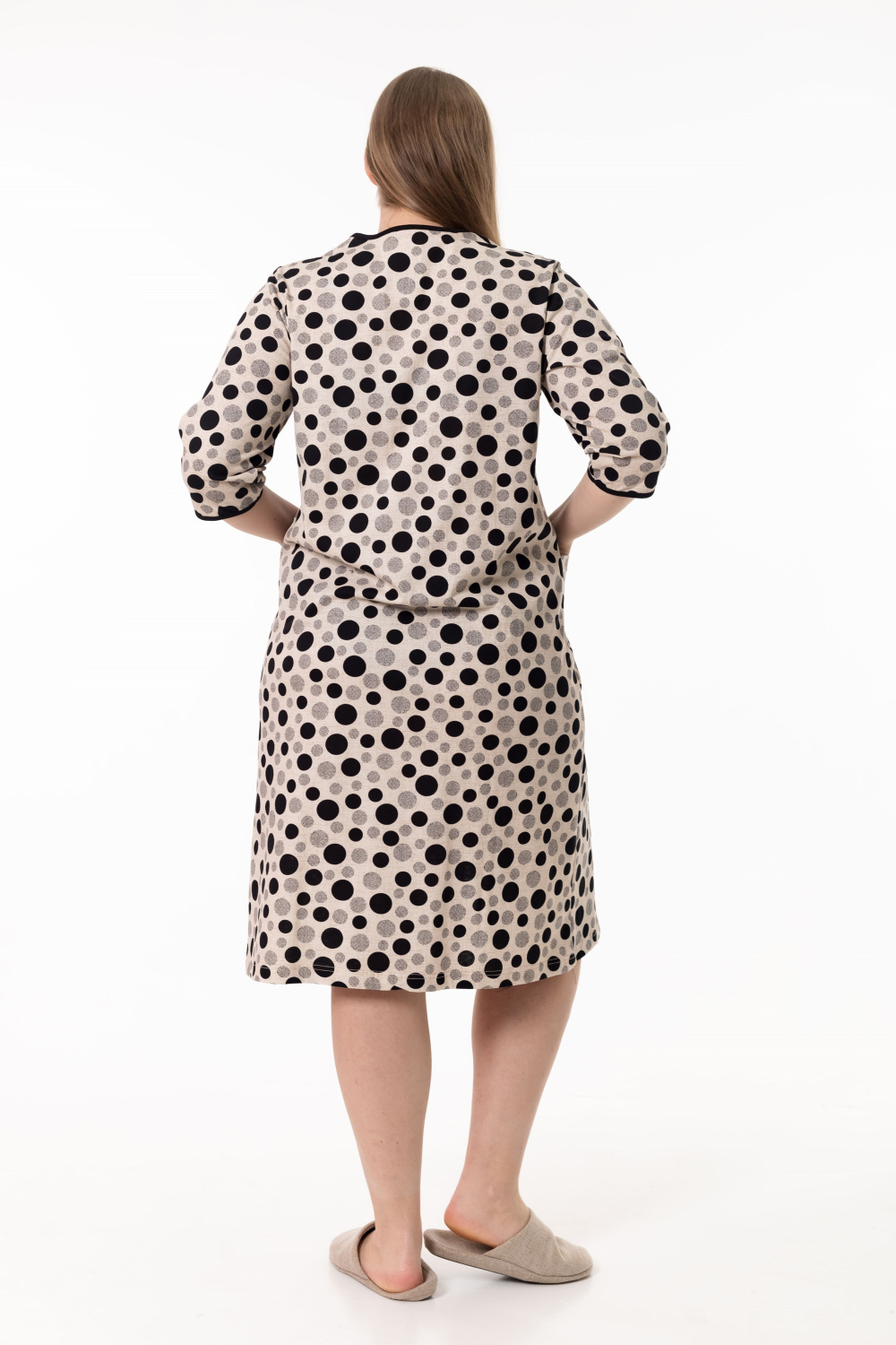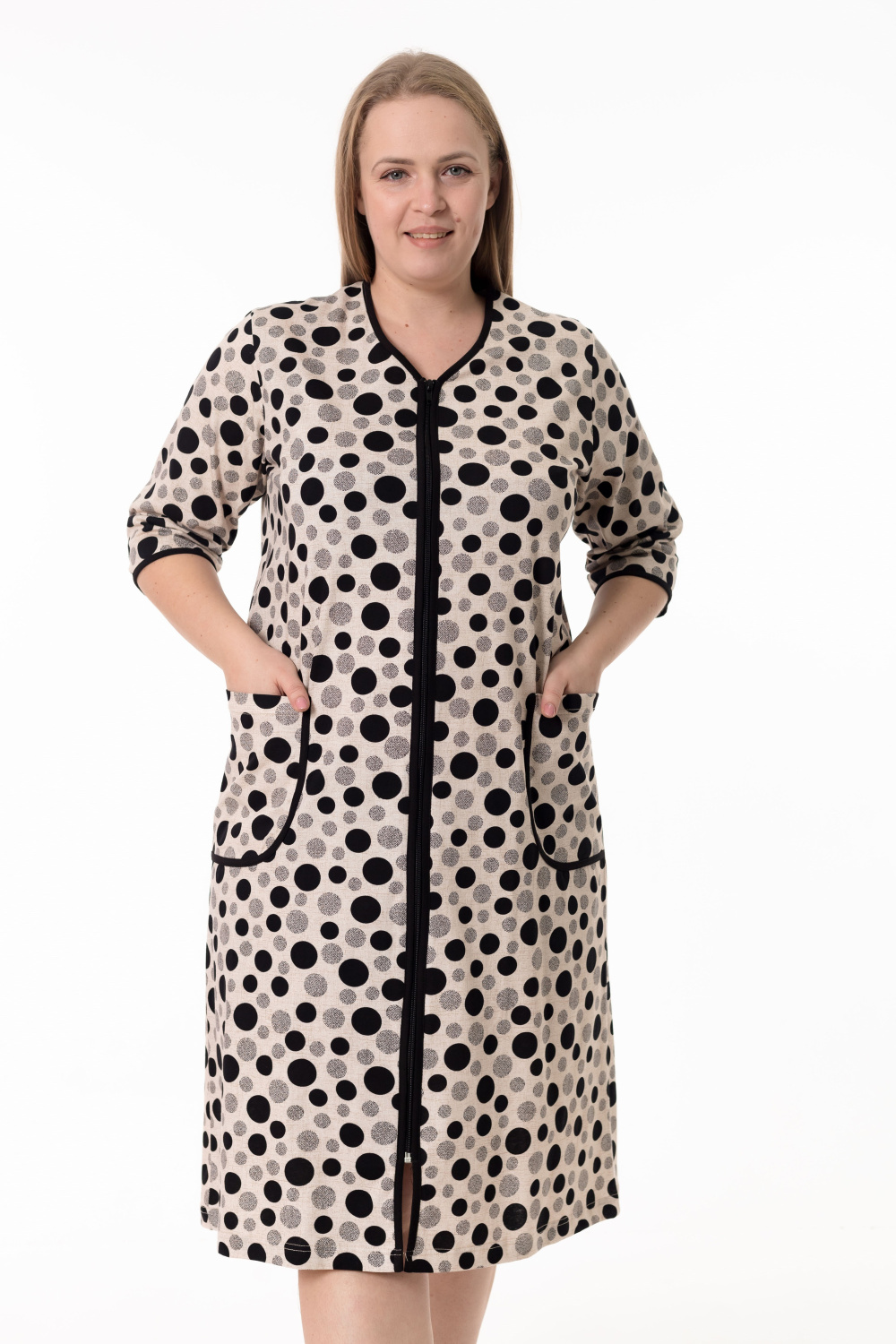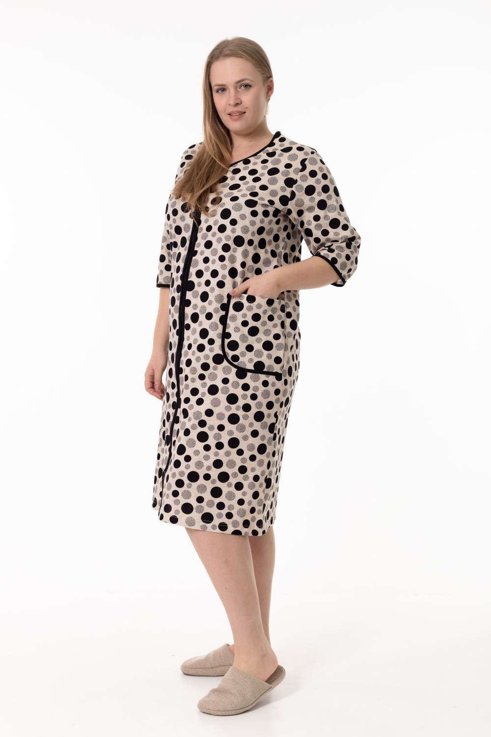 Халат выполнен из мягкой кулирки и станет удобным вариантом для домашнего отдыха и повседневной носки. Модель прямого кроя застёгивается на молнию и имеет V-образный вырез горловины, который придаёт изделию аккуратный и женственный вид. Рукав длиной 3/4 обеспечивает комфорт и свободу движений, а два накладных кармана по бокам добавляют практичности. Горловина, низ рукавов и карманы аккуратно обработаны бейкой, создавая завершённый и аккуратный внешний вид изделия.