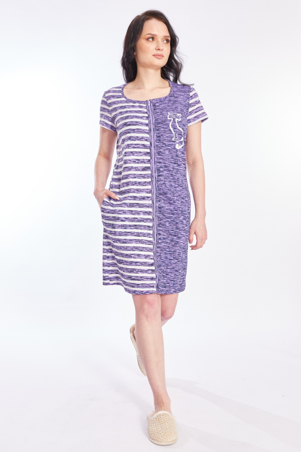 Халат на молнии выполнен из х/б полотна. Рукава короткие, на левой полочке нанесён принт. В боковых швах размещены карманы.