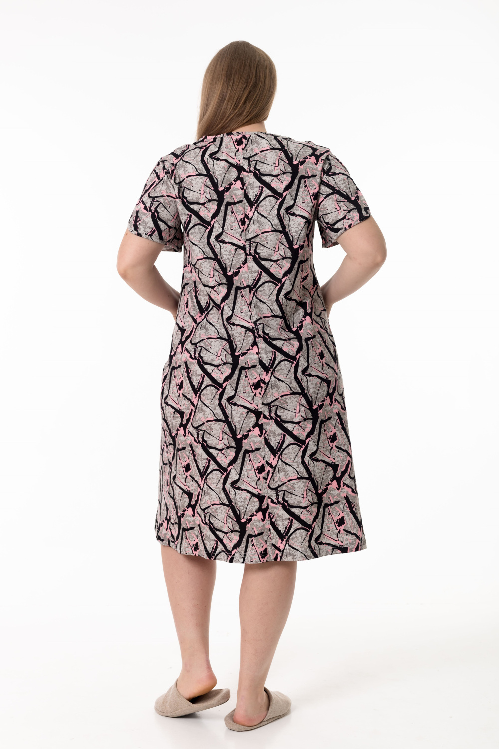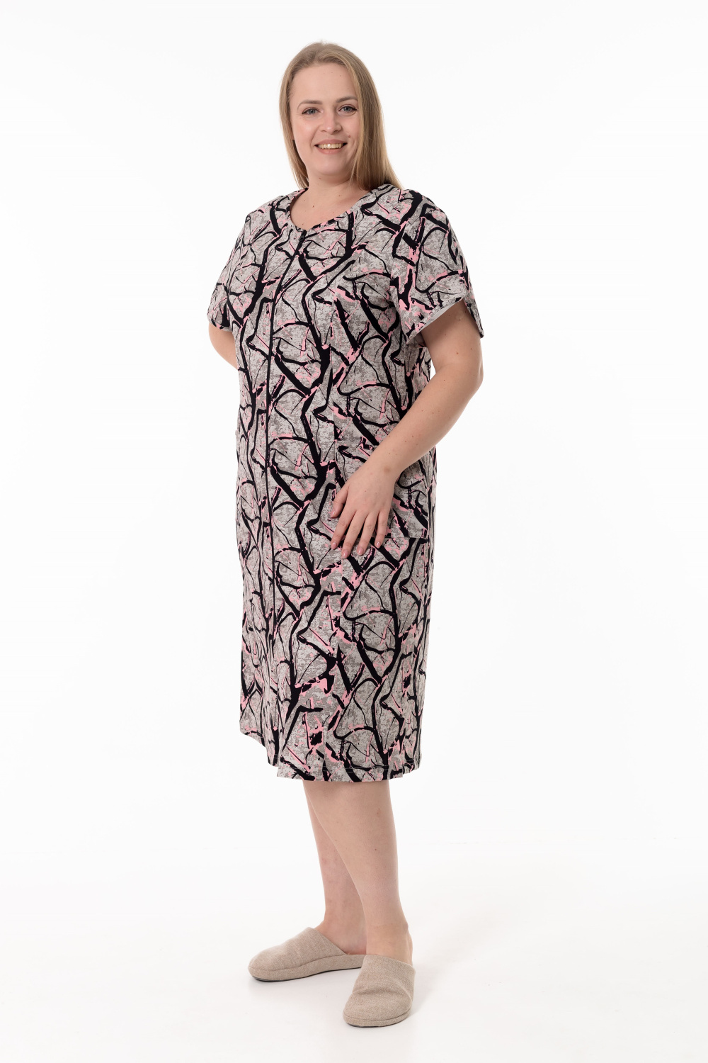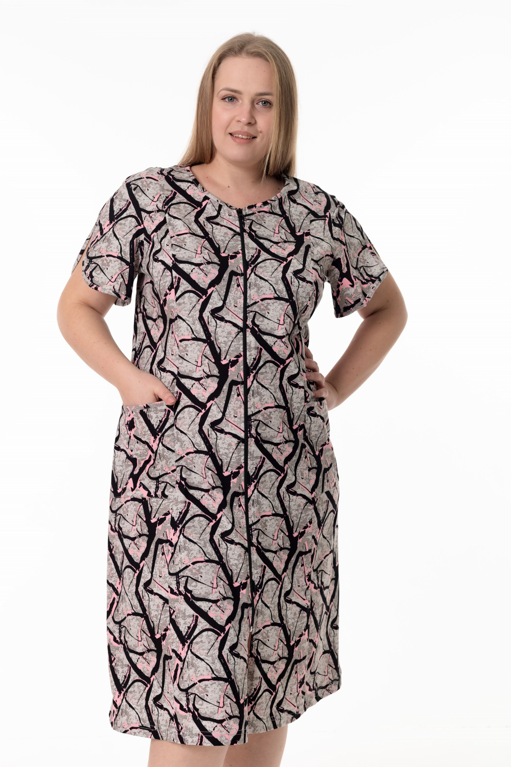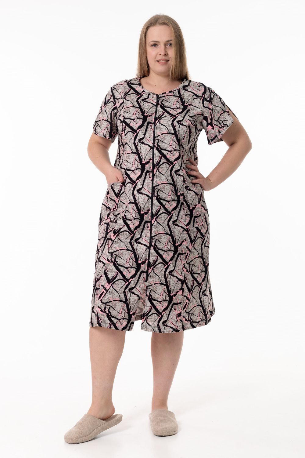 Халат выполнен из мягкой кулирки с набивным рисунком и застёгивается на молнию, обеспечивая удобство в повседневной носке. Модель с коротким втачным рукавом, состоящим из двух частей и оформленным на запах. Халат имеет полуприлегающий силуэт, рельефы от плечевых швов на полочках красиво подчёркивают фигуру. По бокам размещены карманы, вход в которые, как и горловина и низ рукавов, аккуратно обработаны бейкой из основного полотна. Длина изделия до уровня колена делает халат практичным и комфортным для домашнего отдыха.