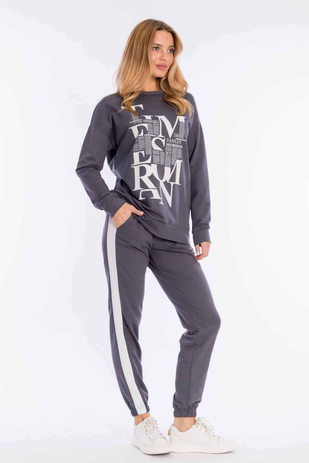 Костюм женский выполнен из однотонной из футер петли с лайкрой, состоит из толстовки с принтом и брюк. Толстовка со спущенной линией плеча, рукава на манжете, низ изделия на пришивном поясе. Горловина обработана бейкой из основного полотна. Брюки заужены к низу, в пояс и низ вставлена резинка. По бокам лампасы и два кармана.