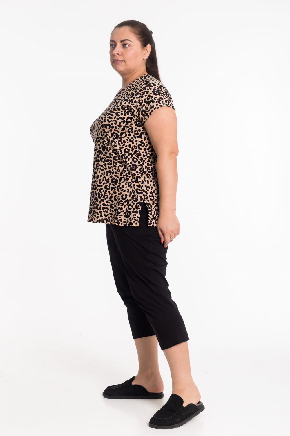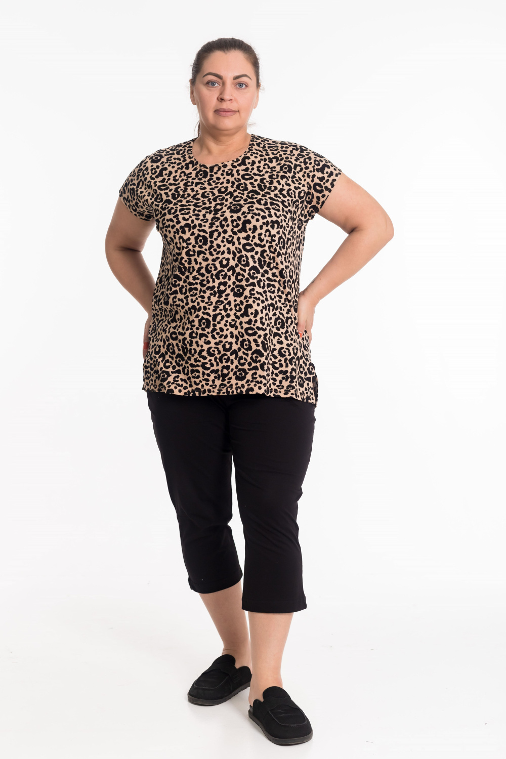 Женский костюм из кулирки — отличный выбор для повседневной носки. Футболка с набивкой "леопард", спущенными рукавами и круглым вырезом горловины украшена разрезами по бокам, что обеспечивает свободу движений. Однотонные капри гармонично дополняют образ. Этот яркий, современный дизайн одежды привлекает внимание своей смелой цветовой гаммой и создает энергичный и стильный образ. Изготовленный из натуральной ткани, костюм обеспечит комфорт в течение всего дня.
