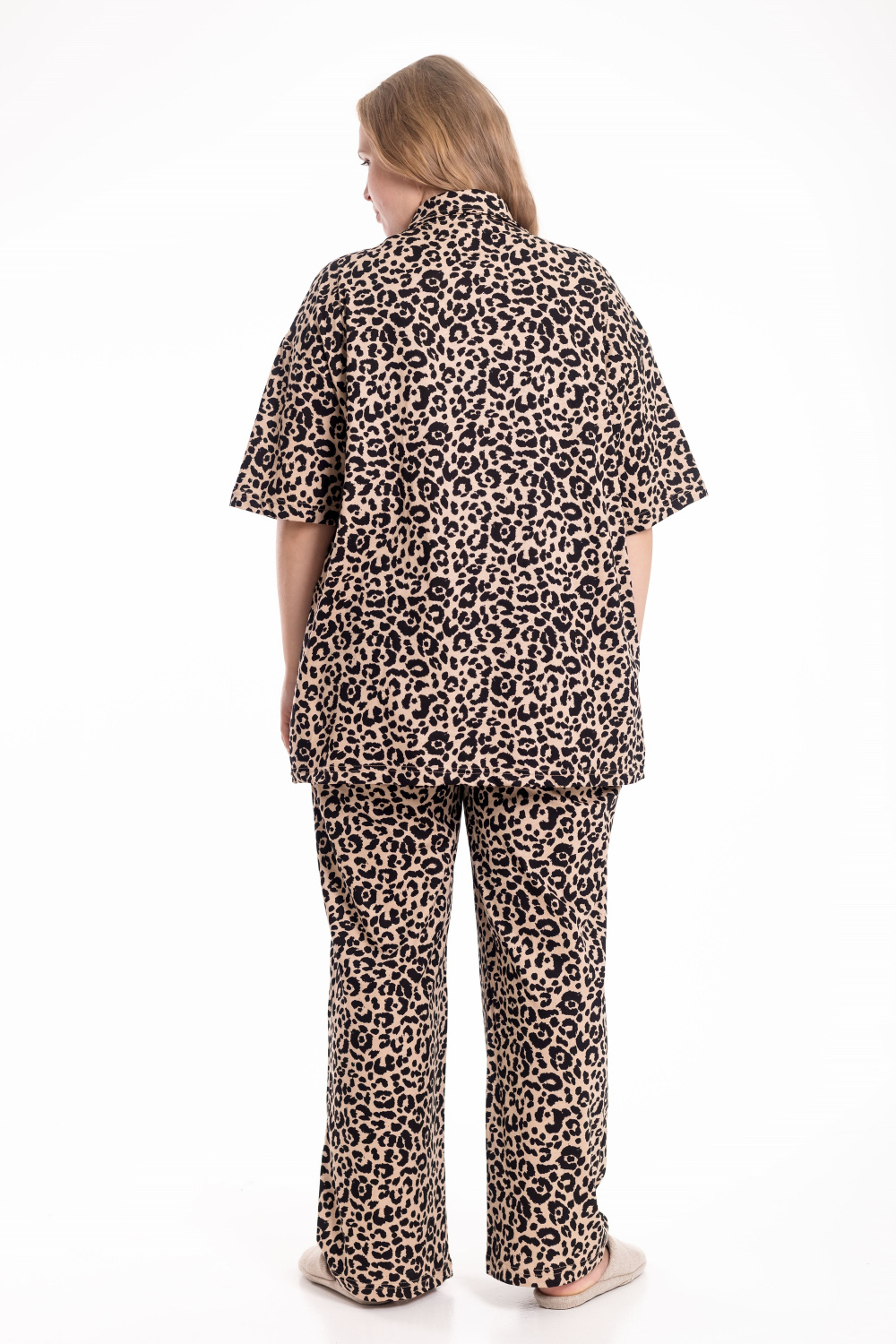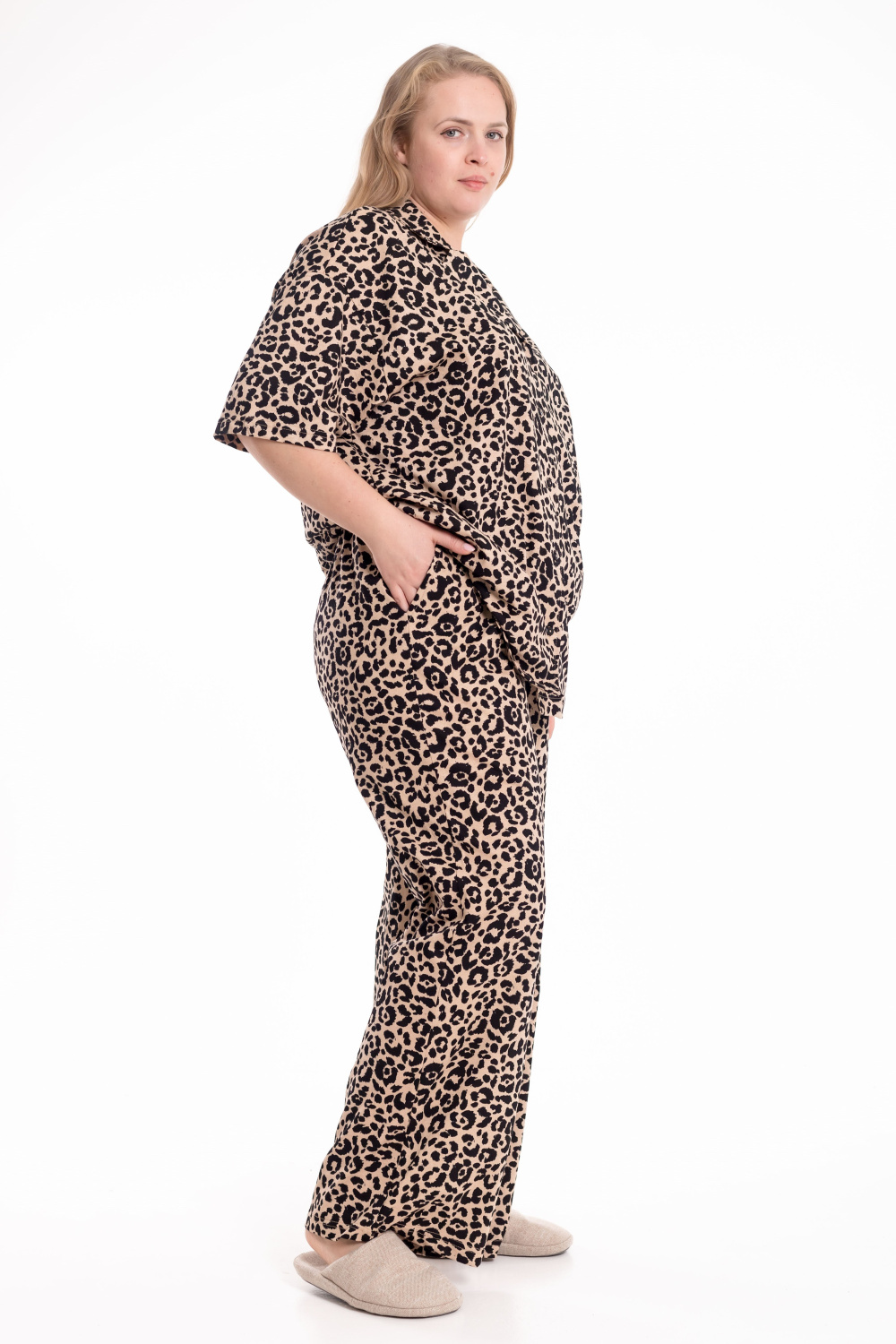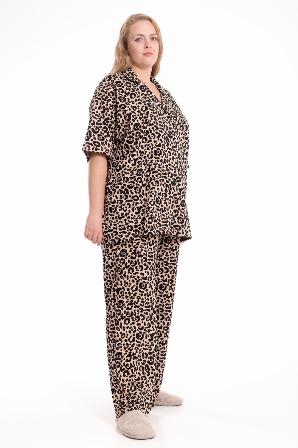 Костюм выполнен из хлопкового полотна и состоит из рубашки и брюк. Рубашка со спущенной линией плеча, рукавом длиной до локтя и застёжкой на пуговицах. Отложной воротник придаёт модели аккуратный и завершённый вид. Брюки прямого кроя с удобным поясом на резинке и боковыми карманами. Лаконичный костюм из натуральной ткани подойдёт для отдыха и повседневной носки.