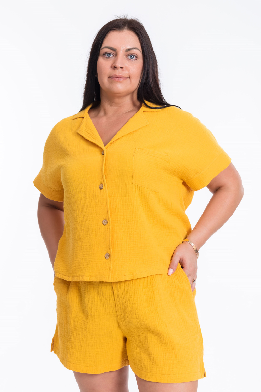 Женский костюм из муслина — отличный выбор для повседневной носки. Рубашка свободного силуэта с цельнокроеным рукавом и застёжкой на пуговицах обеспечивает свободу движений. Боковые разрезы и накладной карман на полочке придают изделию оригинальность. Шорты с боковыми карманами, разрезами внизу и поясом на резинке также обеспечивают комфорт при носке. Однотонный дизайн костюма позволяет сочетать его с различными элементами гардероба. Такой наряд подойдёт для прогулок, неформальных встреч или отдыха. Изготовленный из натуральной ткани, костюм обеспечит комфорт в течение всего дня.