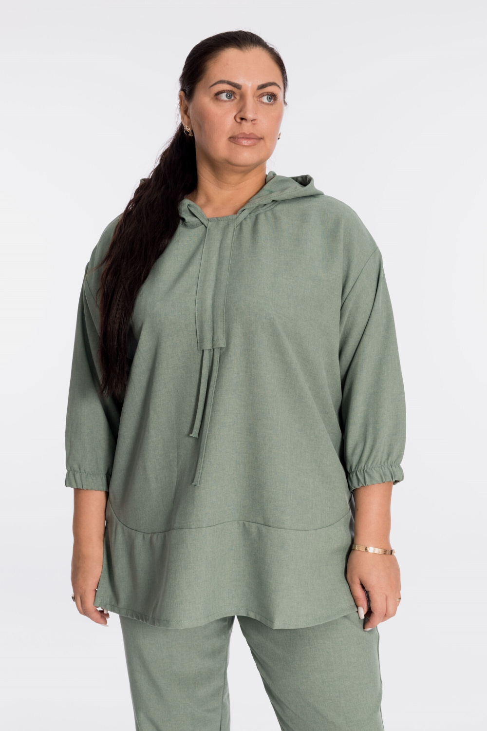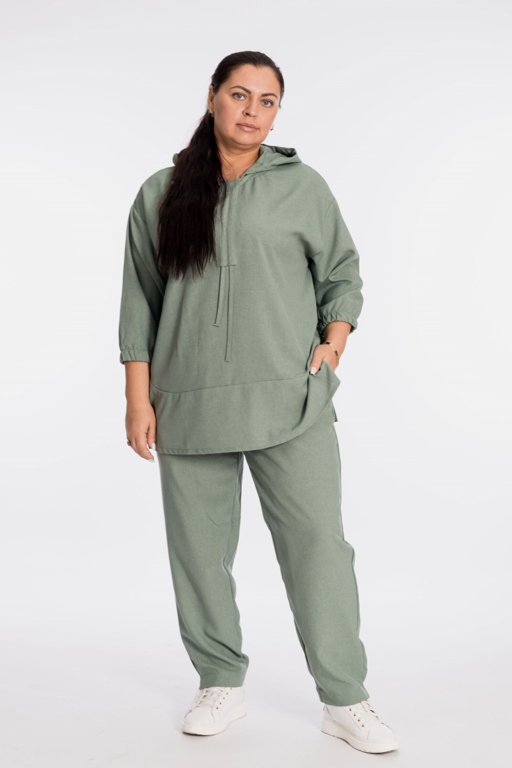 Костюм выполнен из искусственного льна. Состоит из блузы и брюк. Блуза со спущенной линией плеча, низ рукавов длиной 3/4 на резинке. В капюшон вставлен шнур из основного полотна, который далее проходит в кулиску по центру переда. В низу, по бокам блузы разрезы. Брюки с карманами по бокам, пояс на резине. Брюки заужены к низу, в низу боковых швах разрезы.