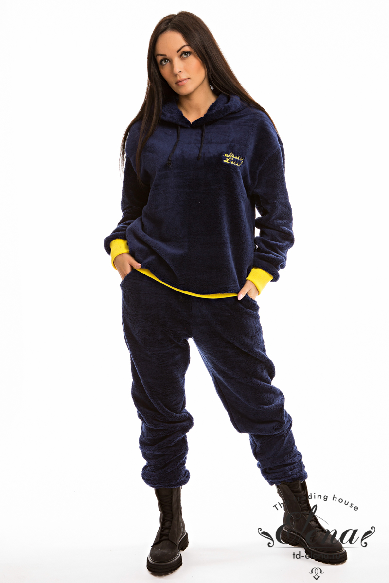 Уютный женский костюм свободной посадки выполнен из велсофта. Толстовка с длинными рукавами, накладным карманом и вышивкой спереди. Ширина капюшона регулируется при помощи шнура. Пояс брюк на резине и шнуре, по бокам размещены карманы. Низ рукавов и брюк на манжетах. Костюм из велсофта - это модный, свежий образ, такой приятный и комфортный к телу.