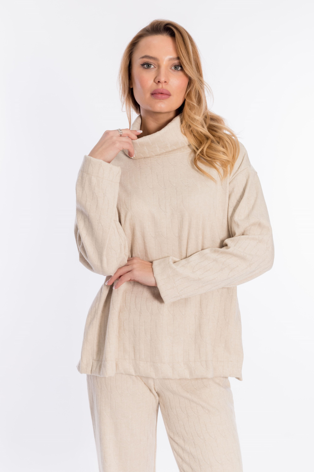 Тёплый костюм свободного кроя выполнен из мягкого и шелковистого полотна с имитацией ручной вязки. Джемпер свободный, с воротником-труба, по бокам разрезы по типу шлиц. Брюки комфортной посадки, свободные, внизу широкие. Пояс на резине.