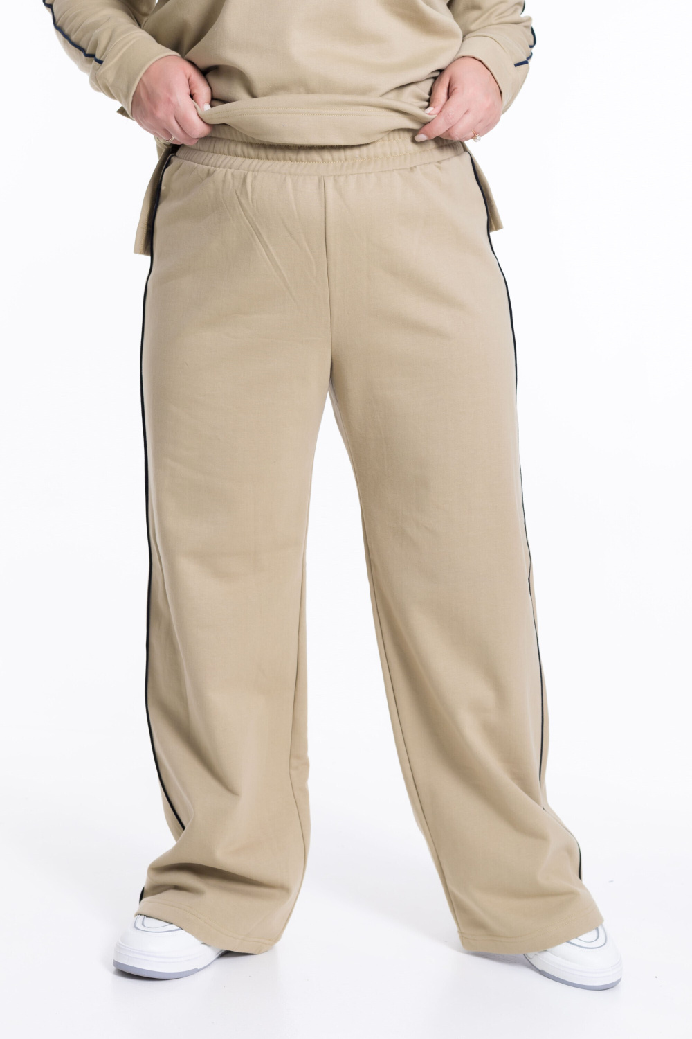 Тёплый и стильный женский костюм из футера с начёсом — отличный выбор для повседневной носки. Кант контрастного цвета, проходящий по рукавам и боковому шву брюк, придаёт изделию оригинальность. Толстовка с принтом спереди и разрезами по бокам обеспечивает свободу движений. Костюм идеально подойдёт для прохладных дней.