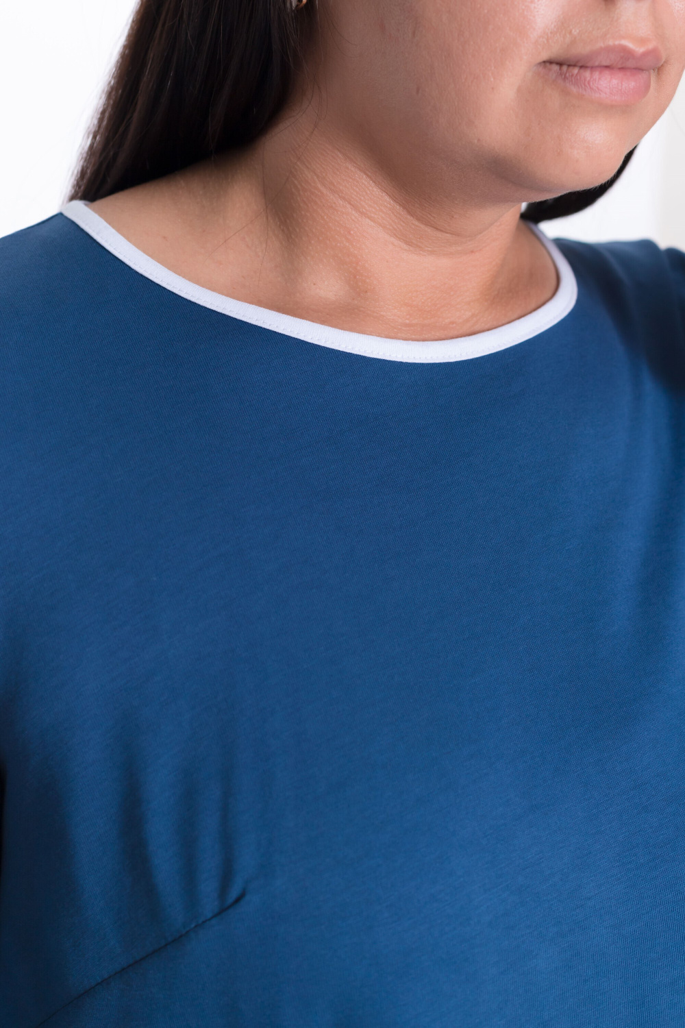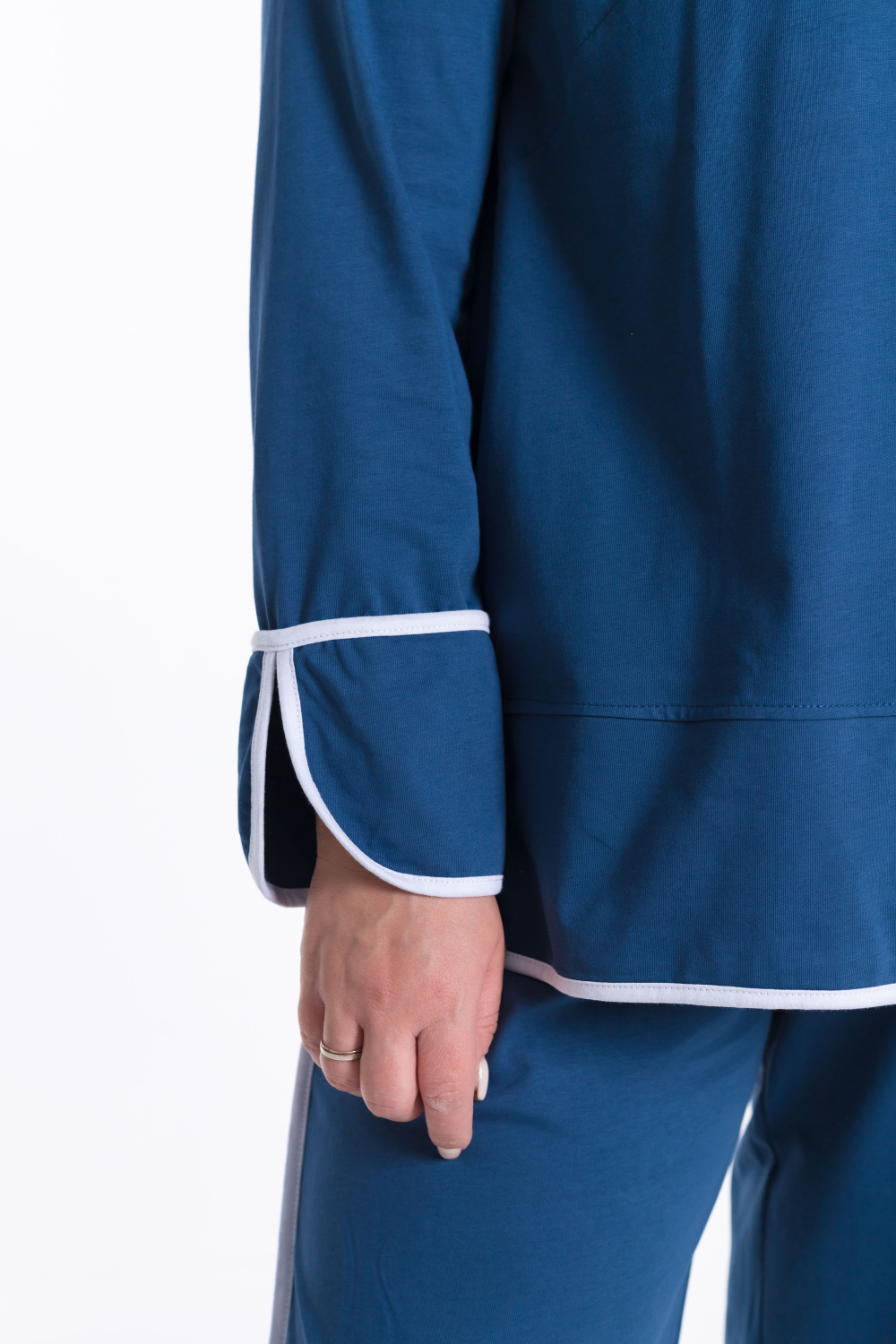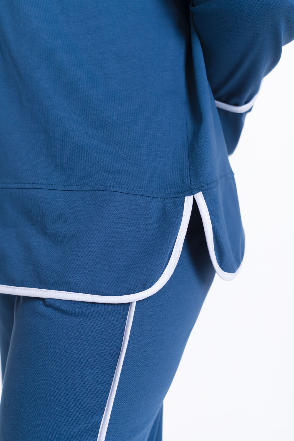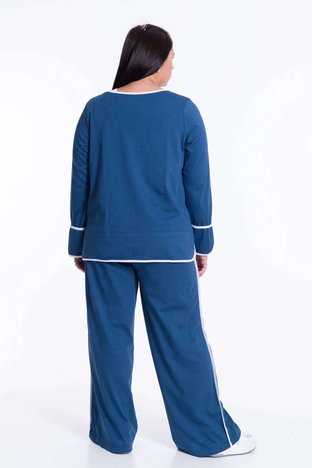 Декоративные элементы костюма - срезы по низу блузки и карманов, обработанные бейкой контрастного цвета. Брюки с боковыми карманами и поясом на резинке, широкие по всей длине. Блуза свободная с круглым вырезом горловины.