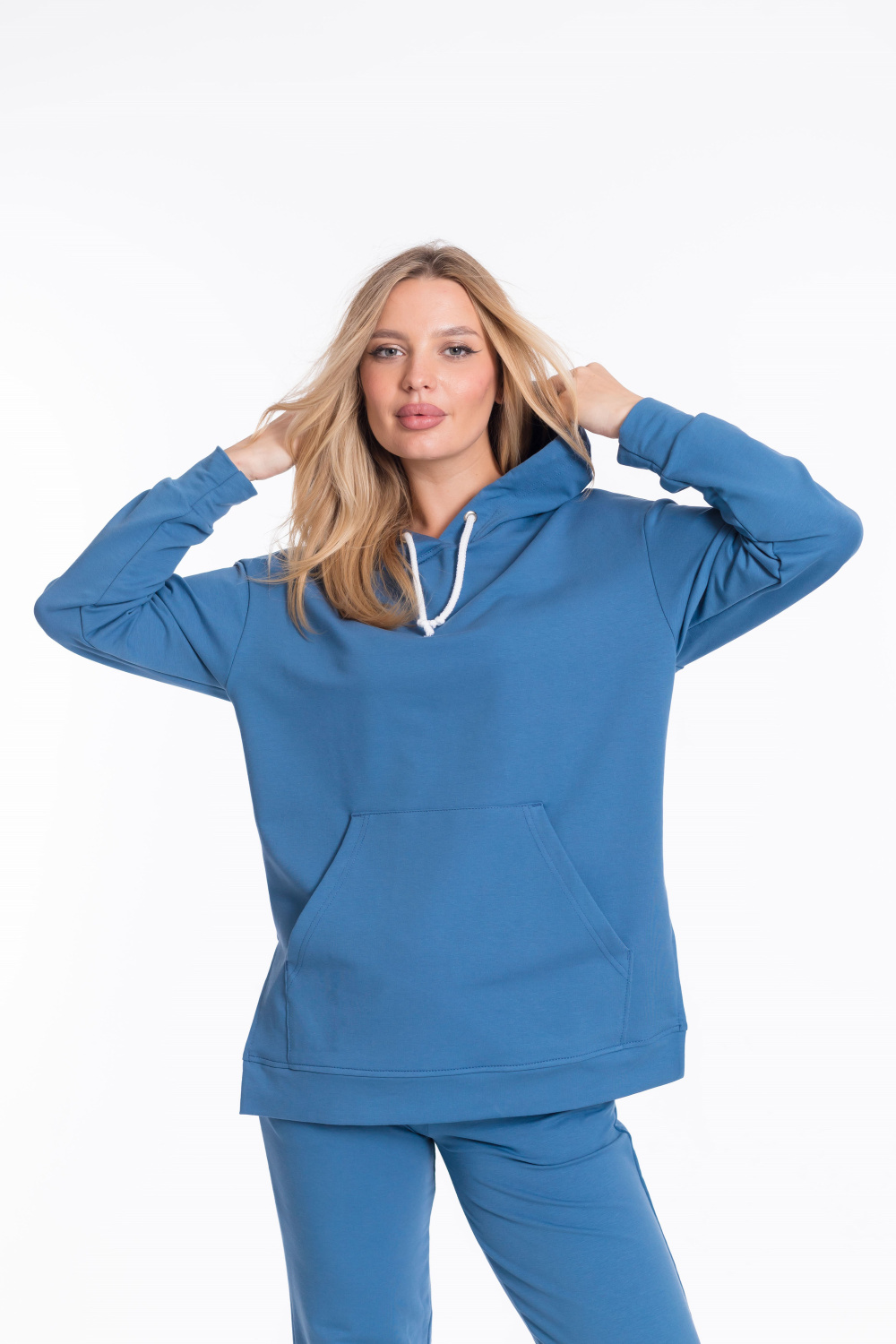 Толстовка имеет удлинённый крой со спущенной линией плеча, что придаёт модели стильный и комфортный вид. Наличие капюшона со шнуром и кармана кенгуру делают её удобной и функциональной. Разрезы по бокам придают изделию оригинальность.