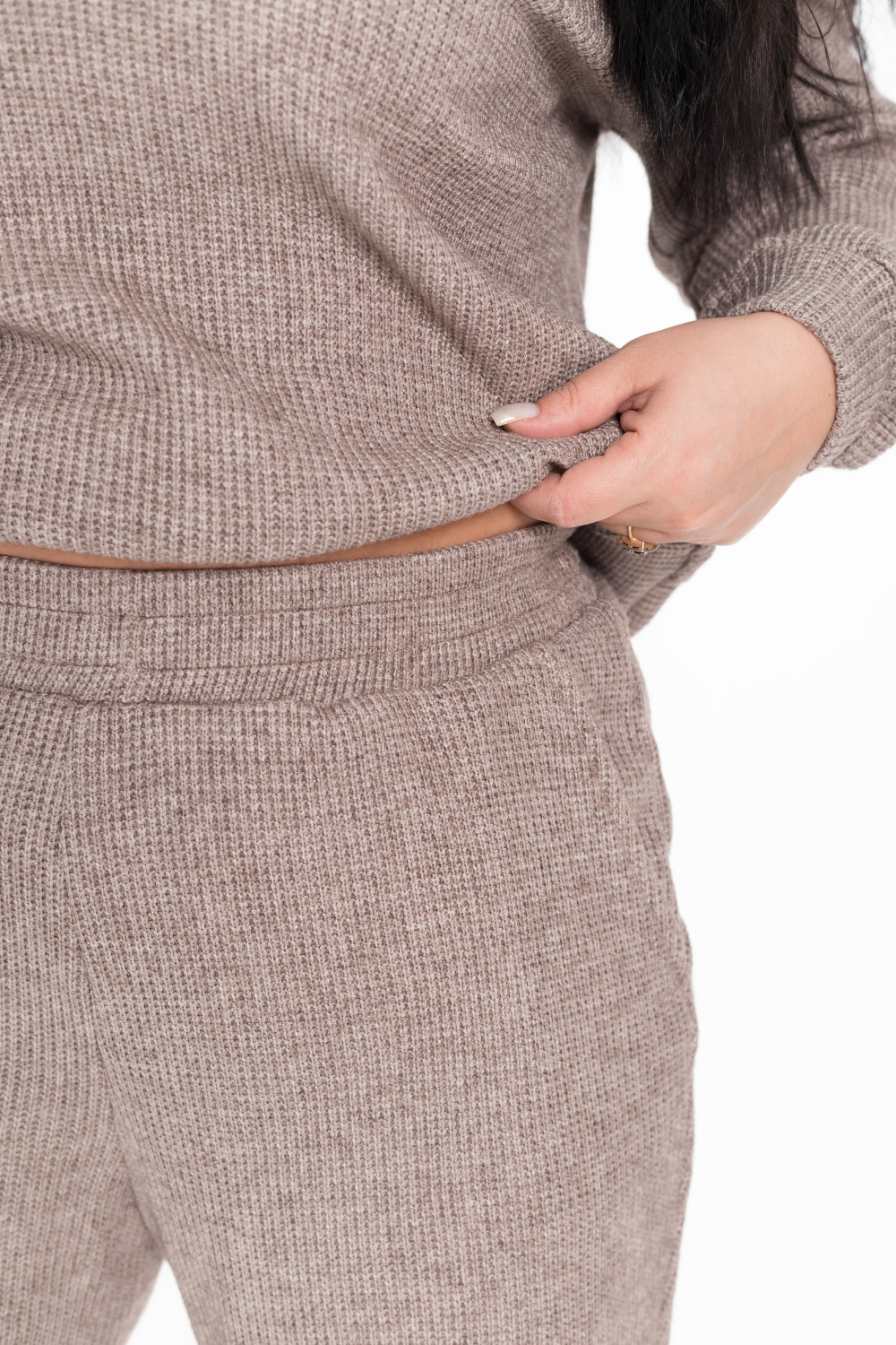 Женский костюм из вязаного полотна в бежевом цвете обещает комфорт, стиль и уют для вашего повседневного образа.
