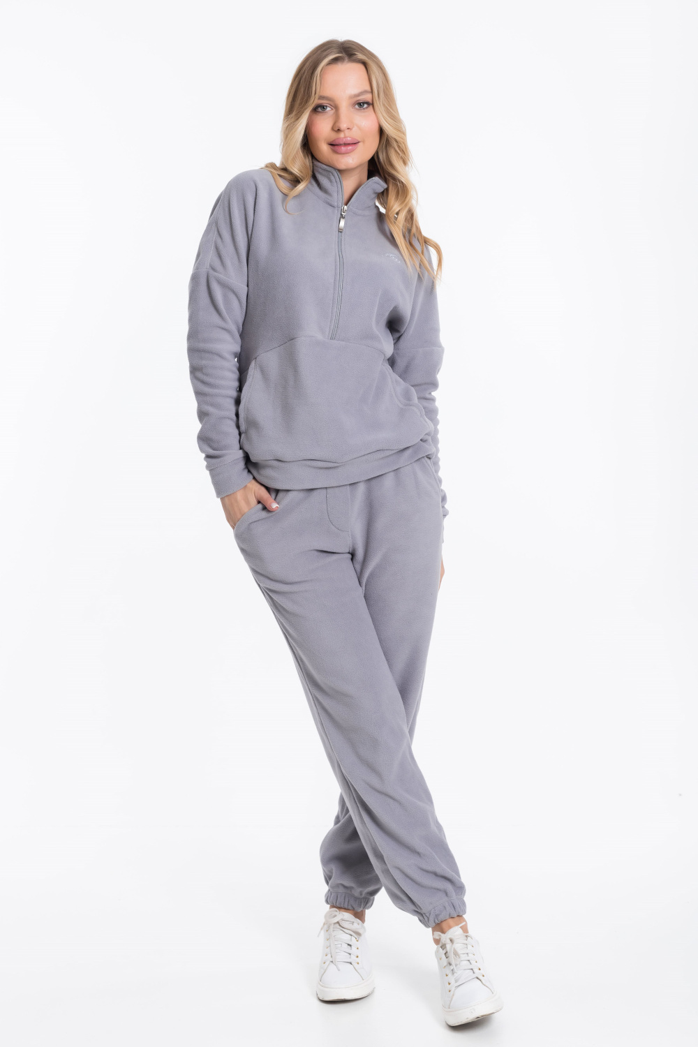 Женский серый флисовый костюм из брюк и толстовки — отличный выбор для повседневной носки. Воротник-стойка с застёжкой на молнию, спущенные рукава и манжеты на рукавах обеспечивают комфорт. Вышивка спереди и карман-кенгуру придаёт изделию оригинальность. Крой брюк свободный. Широкий пояс на резинке и низ штанин на резинке сохраняют тепло. Боковые карманы на брюках практичны, а имитация ширинки добавляет изюминку.