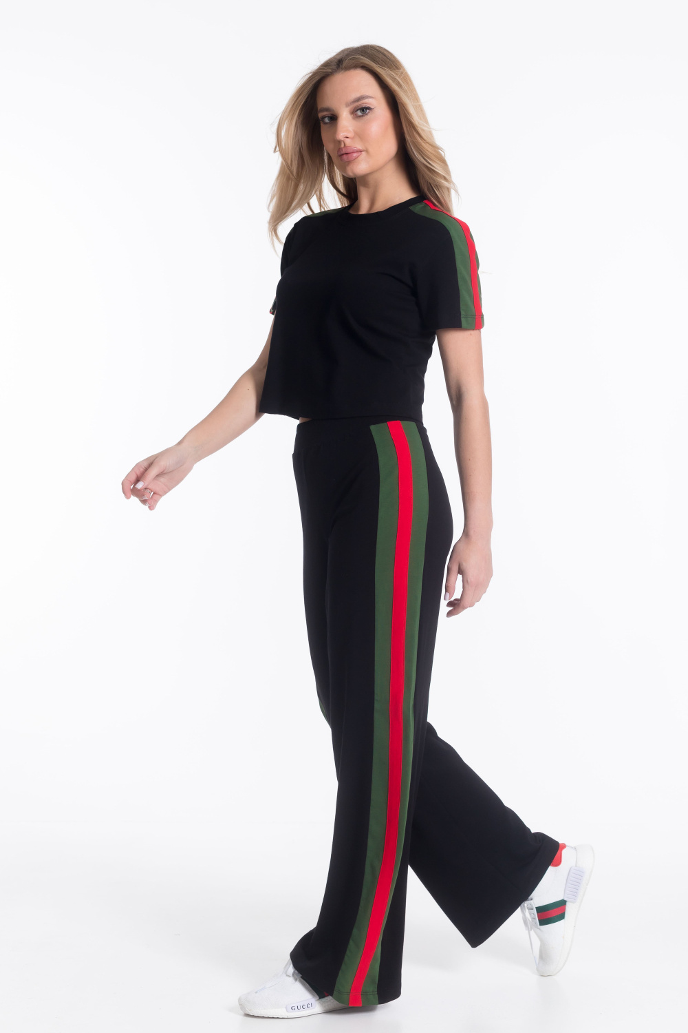 Женский костюм из х/б полотна с добавлением лайкры — отличный выбор для повседневной носки. Укороченная футболка с круглым вырезом горловины обеспечивает свободу движений, а свободные брюки с поясом на резинке и боковыми карманами гарантируют комфорт. Лампасы контрастного цвета на рукавах и брюках добавляют изюминку в дизайн костюма. Такой наряд подойдёт для прогулок, неформальных встреч или отдыха.