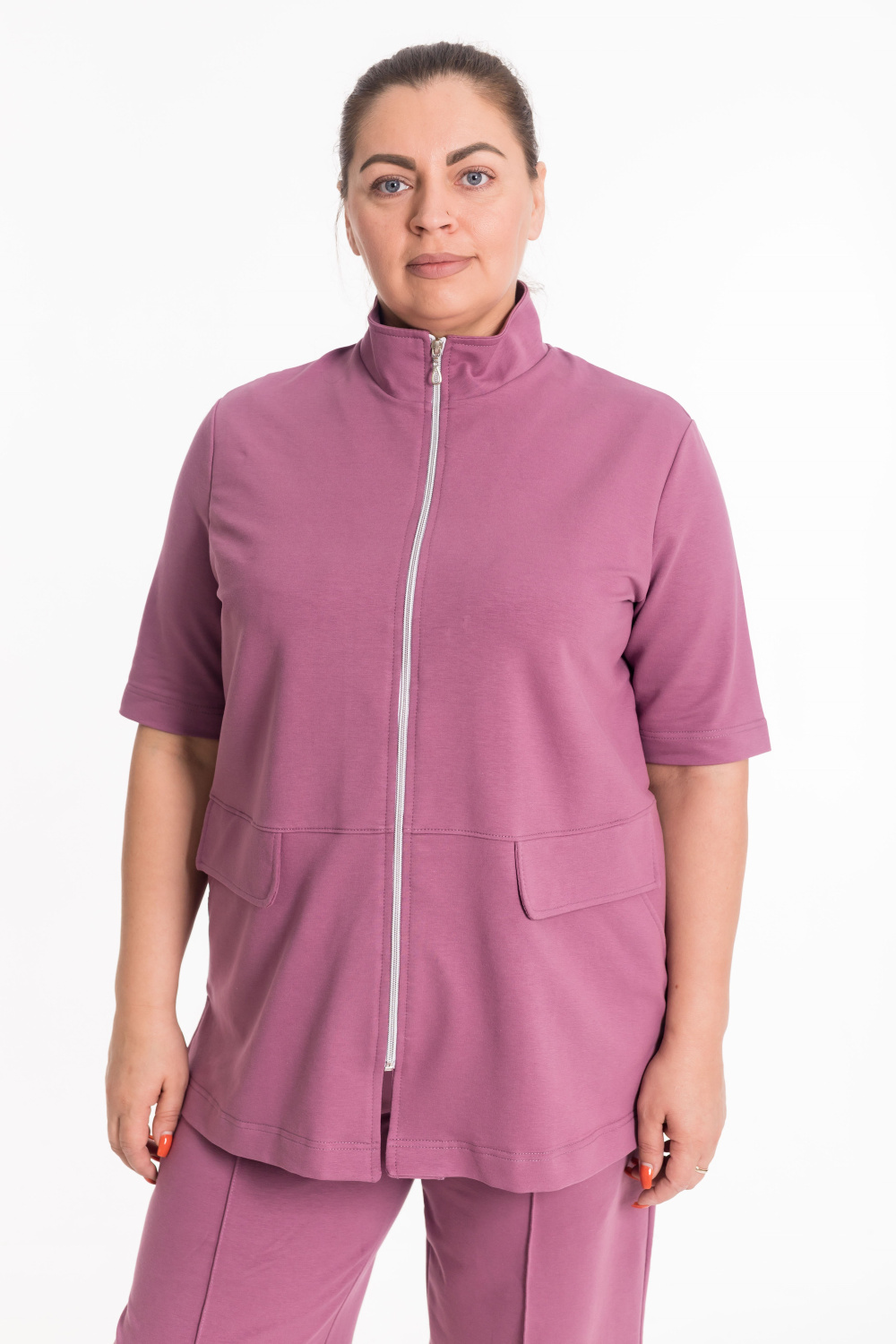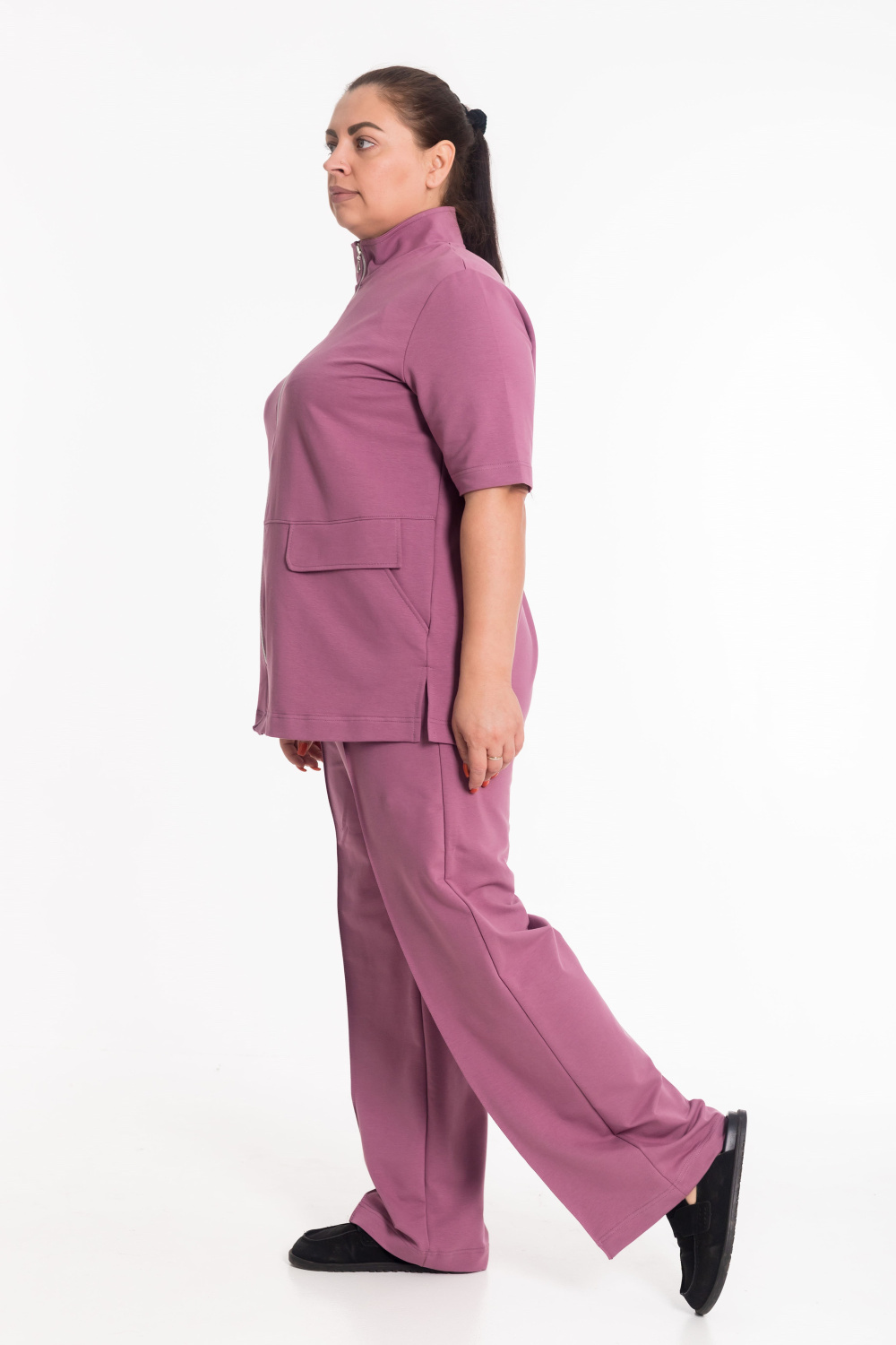 Женский костюм выполнен из однотонного футера с лайкрой и состоит из брюк и рубашки на молнии. Брюки имеют удобный притачной пояс и боковые карманы. Рубашка с воротником-стойкой дополнена горизонтальным подрезом на полочках, от которого начинаются боковые карманы с клапанами. В боковых швах предусмотрены разрезы для комфорта. Рукава длиной до локтя делают образ стильным и практичным.
