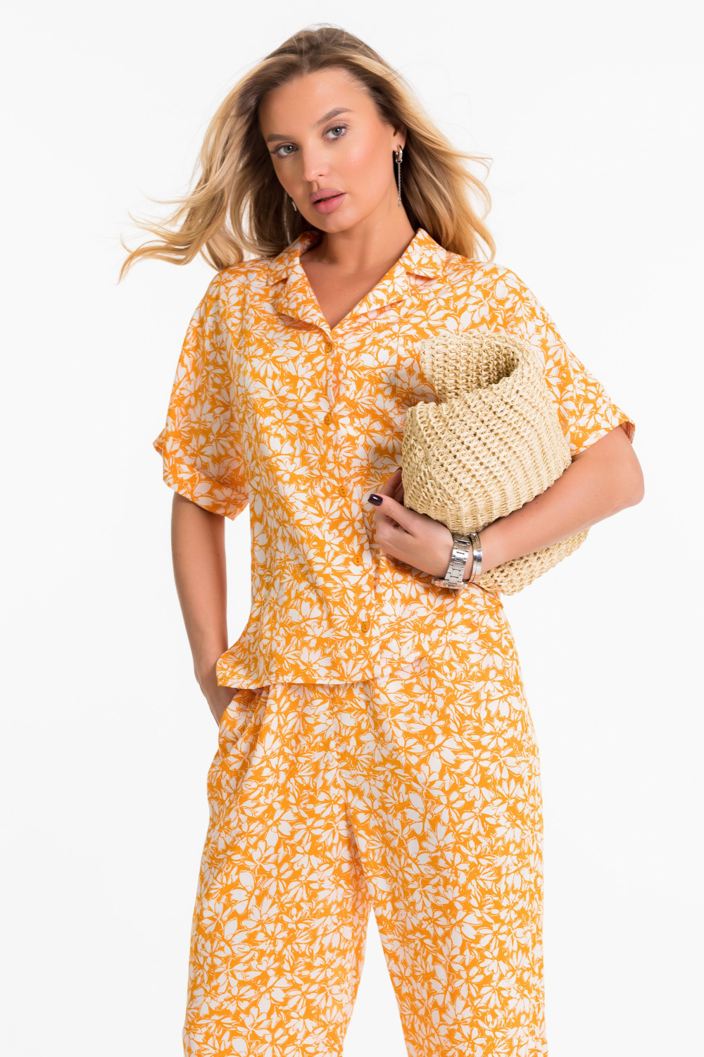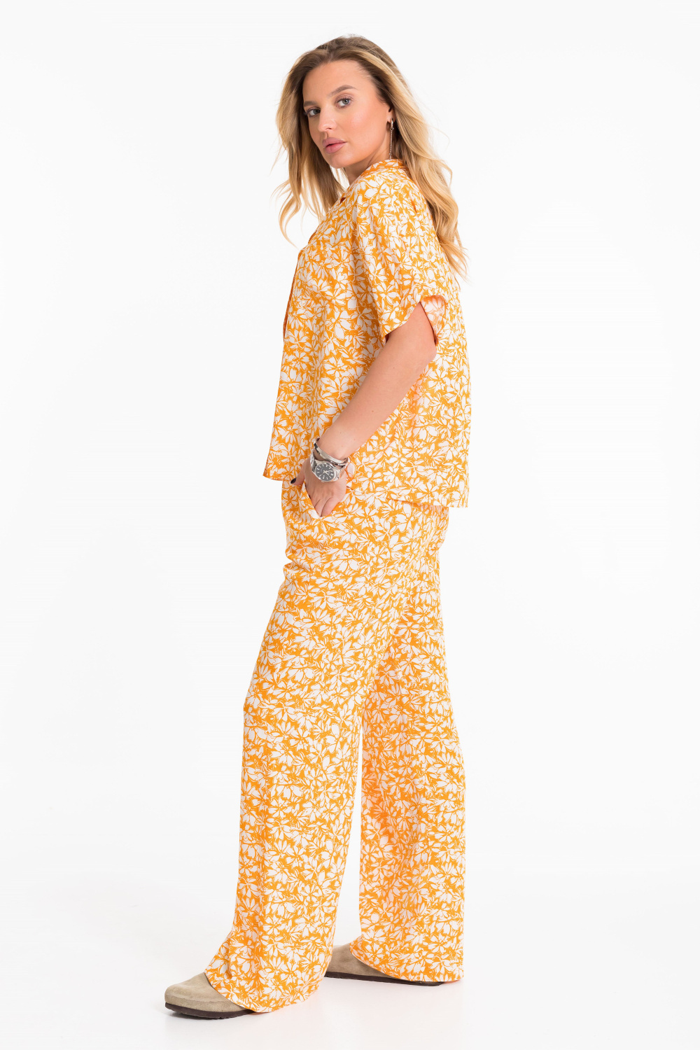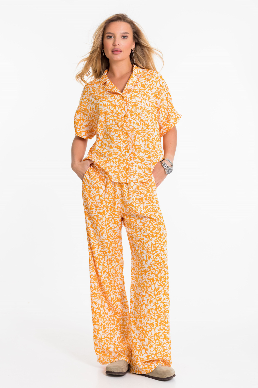 Костюм выполнен из лёгкого и приятного к телу штапельного полотна с набивным рисунком. В комплект входят рубашка и брюки. Рубашка свободного фасона (оверсайз), с цельнокроеными рукавами длиной чуть выше локтя и аккуратными отложными манжетами. На спинке — застроченная бантовая складка, обеспечивающая дополнительную свободу движений. Застёжка на пуговицы, отложной воротник и накладной карман на груди завершают образ. Брюки прямого свободного кроя с комфортным притачным поясом и регулирующим шнуром. По бокам — удобные карманы. Этот комплект — универсальный выбор для прогулок, работы и отдыха. Лёгкость ткани и продуманный крой обеспечат максимальный комфорт в течение всего дня.