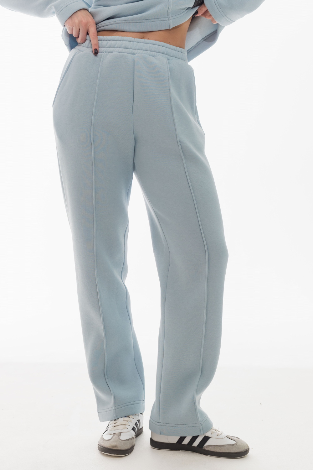 Костюм выполнен из мягкого полотна с начёсом, что делает его уютным и практичным. В комплект входит толстовка со спущенным рукавом и капюшоном, украшенная декоративной лейбой внизу. Брюки прямые, дополнены боковыми карманами и притачным поясом с резинкой внутри для удобной посадки. На передних половинках брюк выполнены аккуратные простроченные стрелки, придающие образу стильный и завершённый вид.