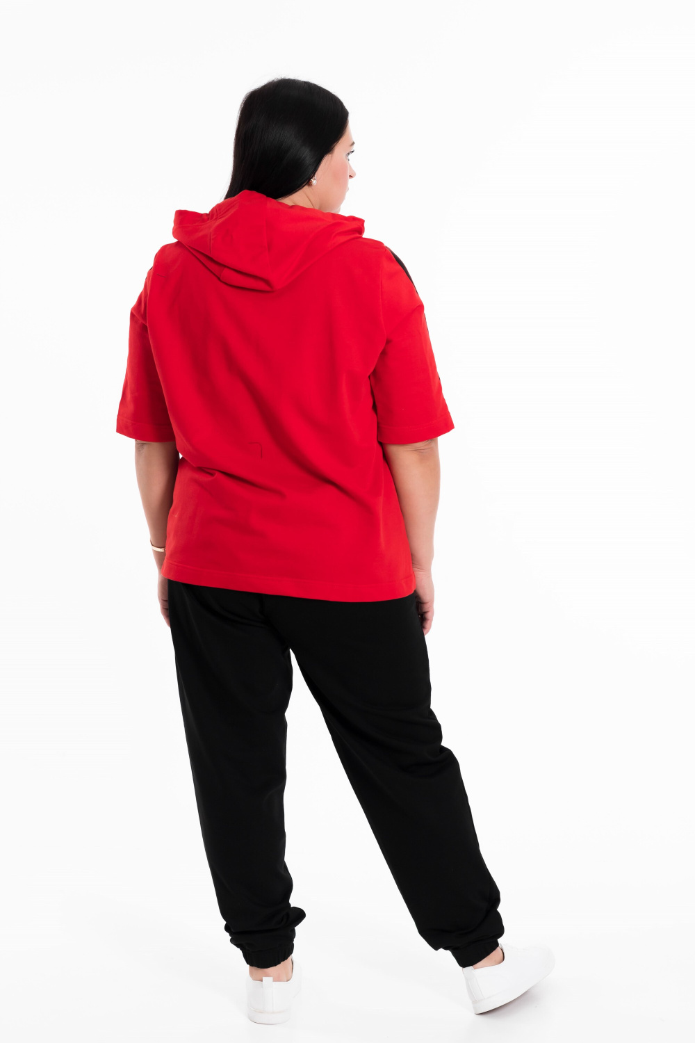 Женский костюм выполнен из хлопкового футера. Толстовка с короткими рукавами, прорезными карманами и застёжкой на молнию. Ширина капюшона регулируется при помощи шнура. Брюки с карманами по бокам, пояс и низ брюк на резине.