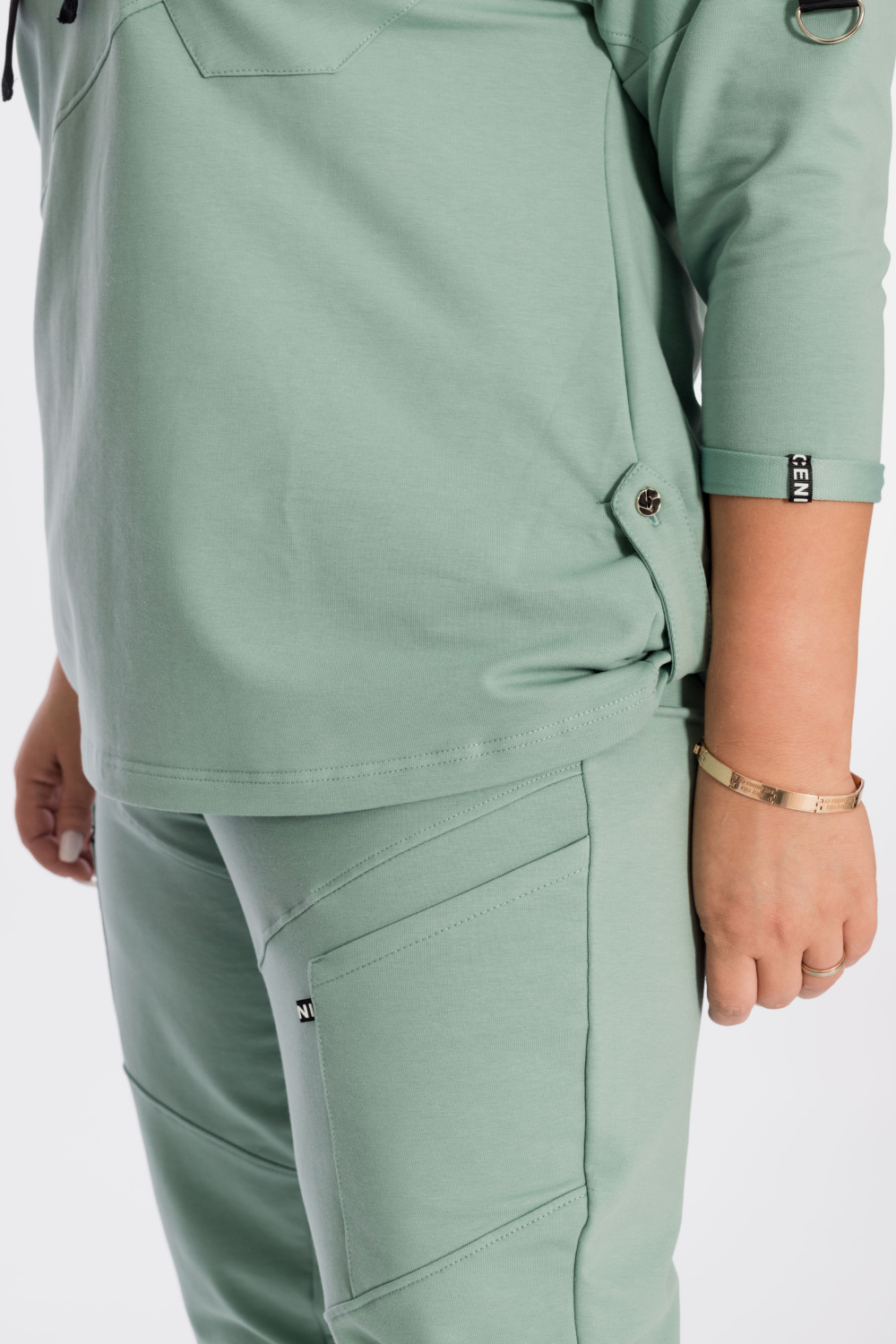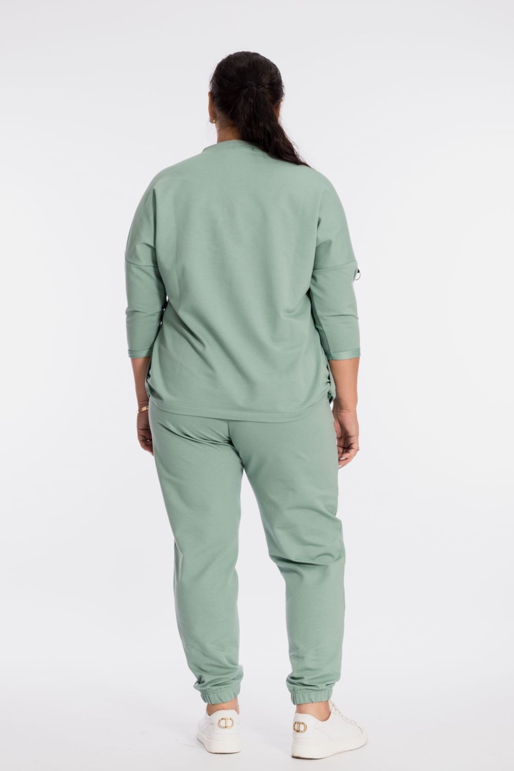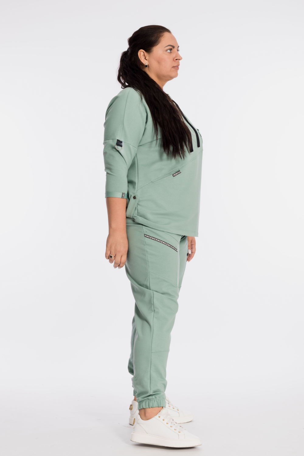 Костюм выполнен из футер петли с лайкрой. Состоит из брюк и толстовки. Толстовка со спущенной линией плеча, рукавом длиной 3/4, в горловине через люверсы проложен шнур. Спереди расположены два кармана, по низу отделка паты. Брюки с резиной на поясе и по низу, по бокам размещены карманы. Детали костюма с отделкой декоративными элементами и репсовой лентой.