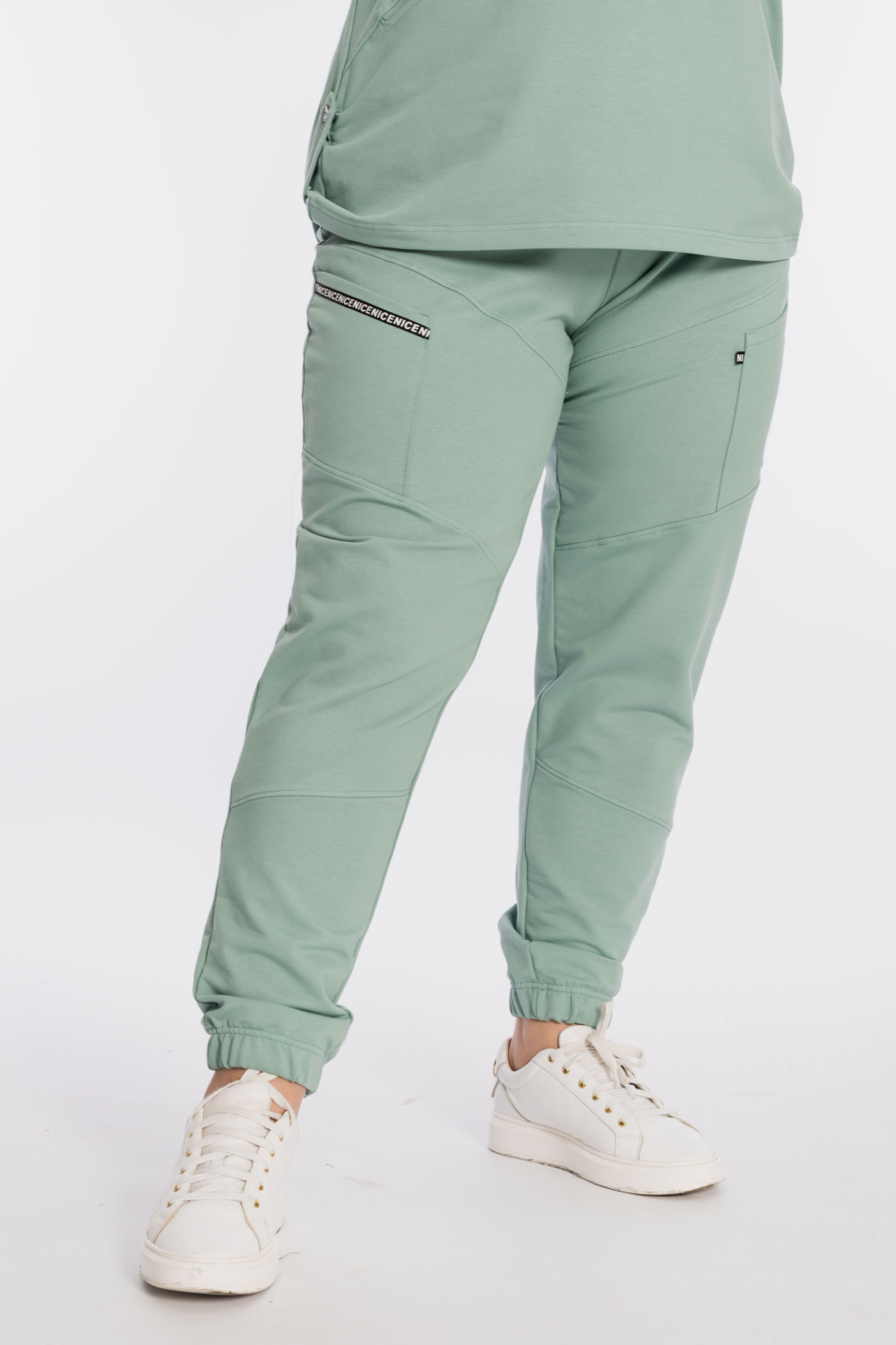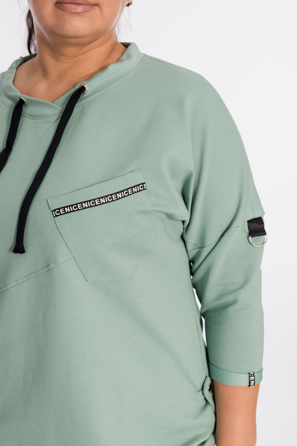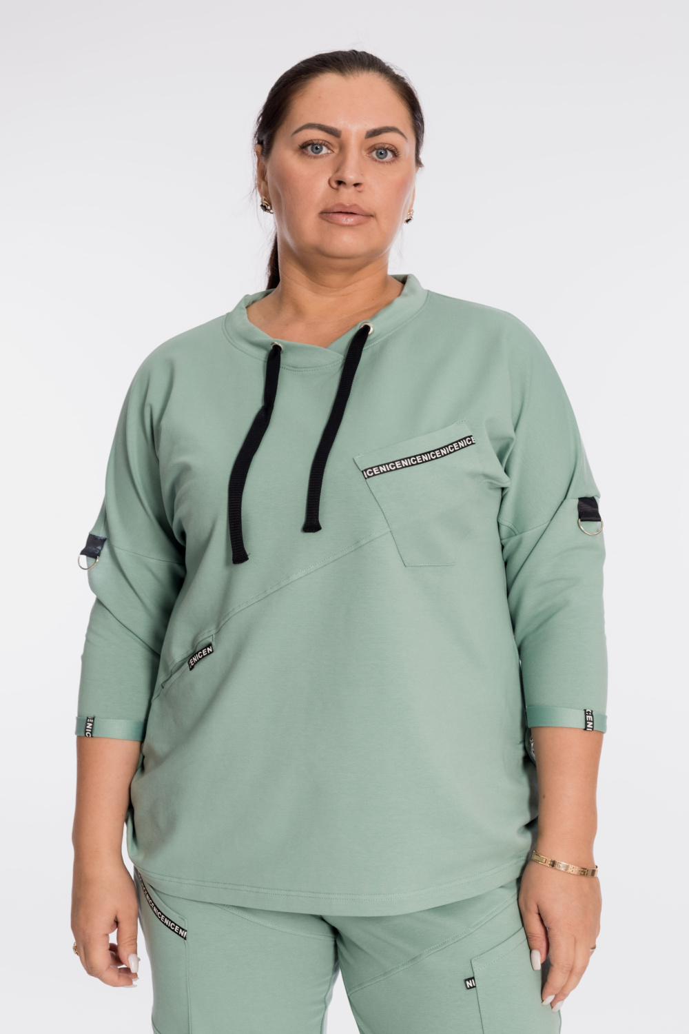 Костюм выполнен из футер петли с лайкрой. Состоит из брюк и толстовки. Толстовка со спущенной линией плеча, рукавом длиной 3/4, в горловине через люверсы проложен шнур. Спереди расположены два кармана, по низу отделка паты. Брюки с резиной на поясе и по низу, по бокам размещены карманы. Детали костюма с отделкой декоративными элементами и репсовой лентой.