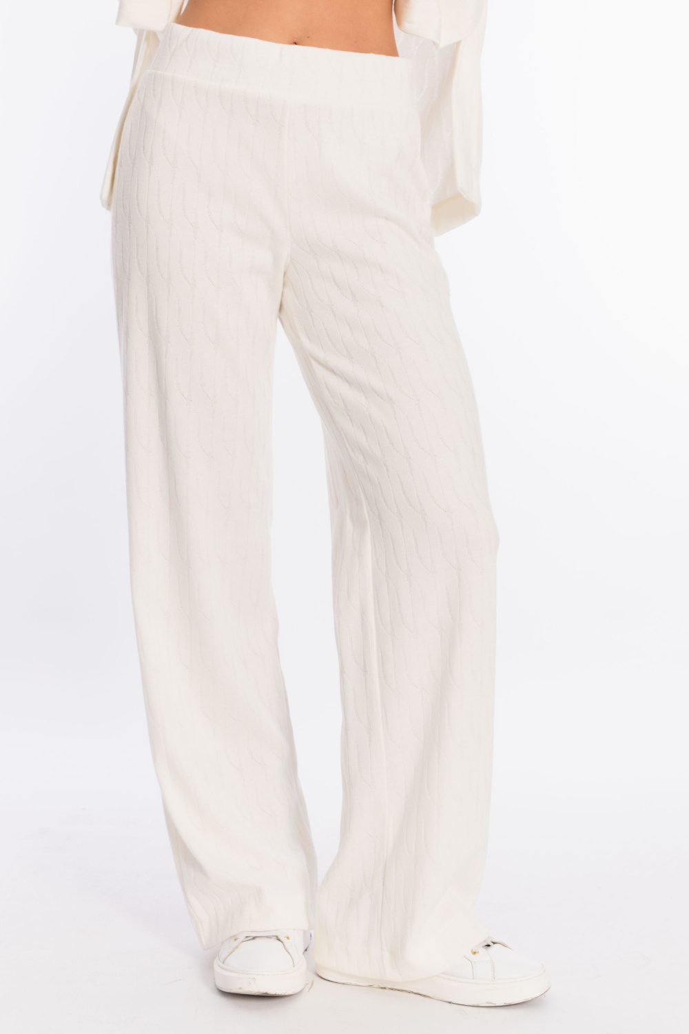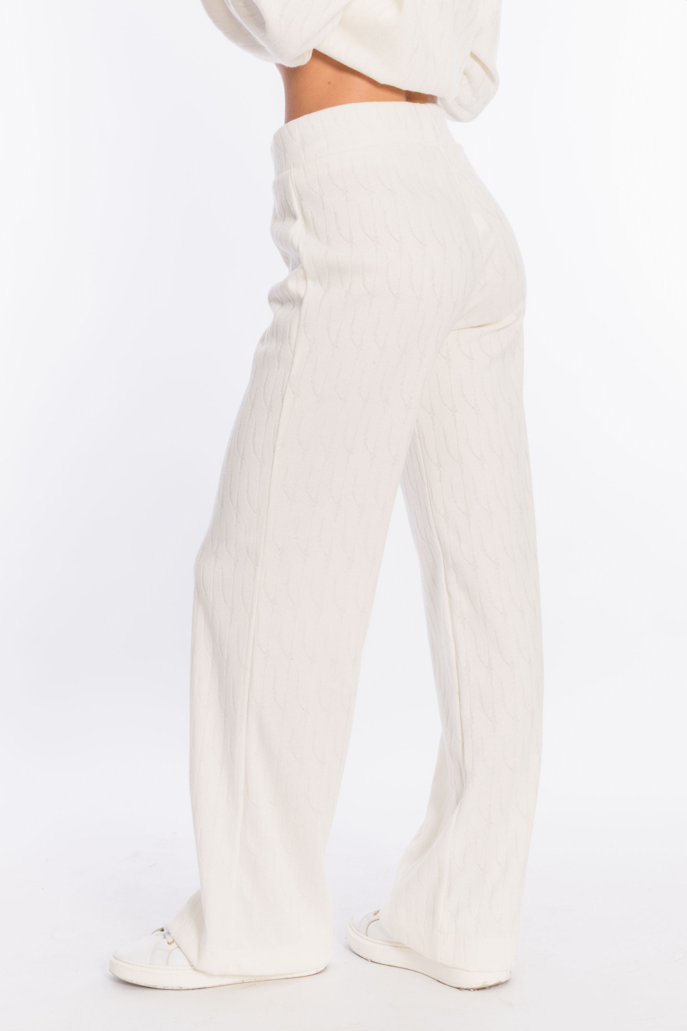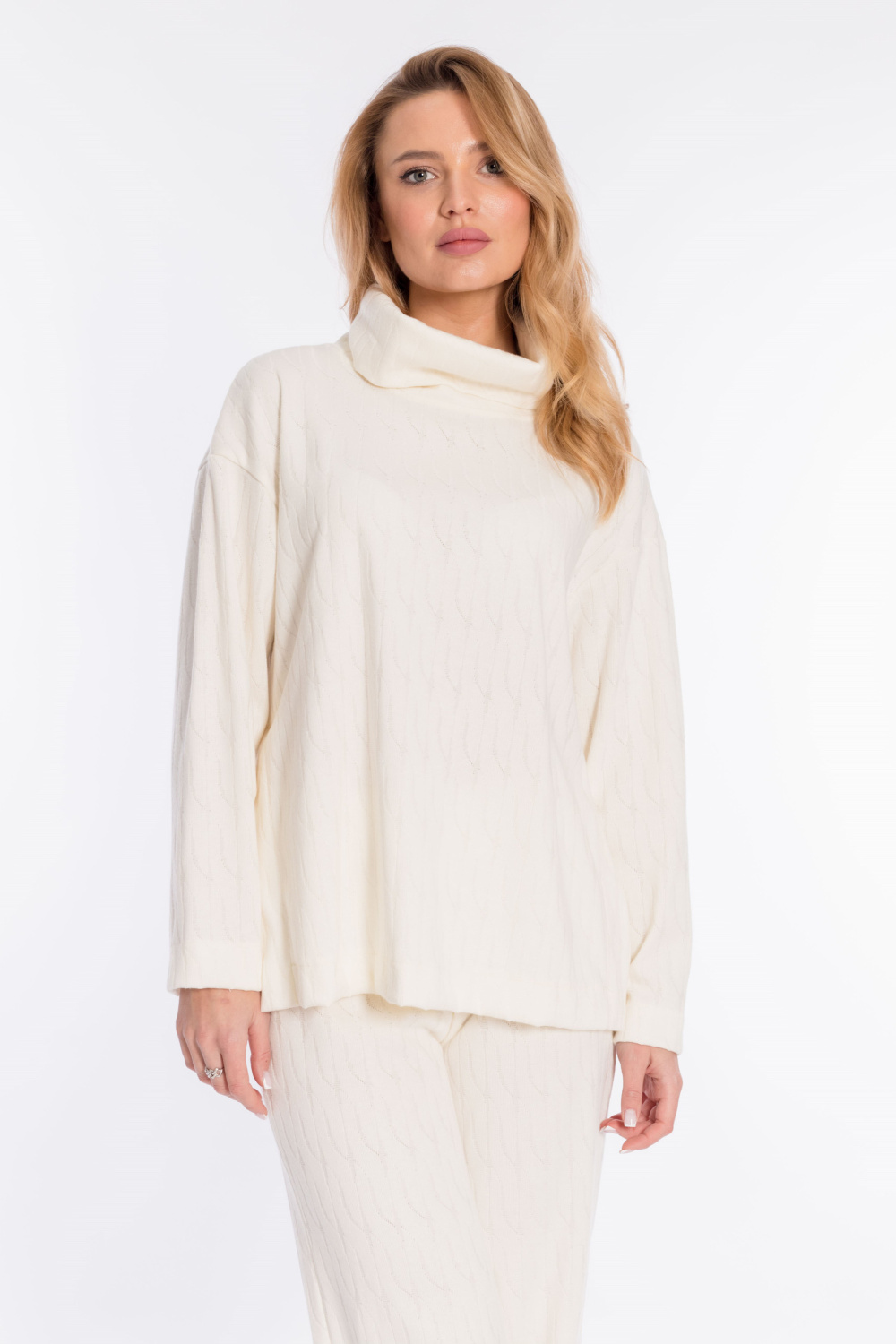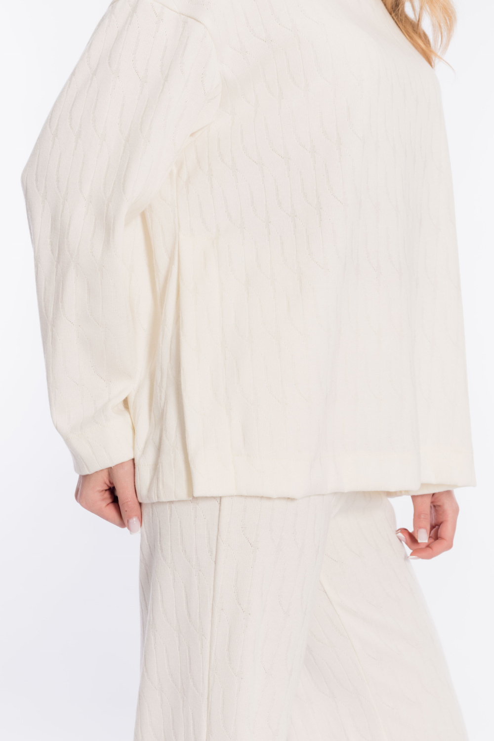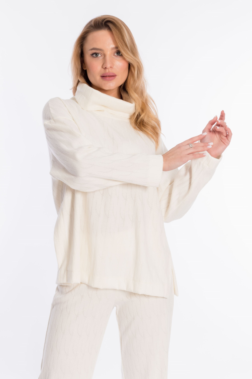 Тёплый костюм свободного кроя выполнен из мягкого и шелковистого полотна с имитацией ручной вязки. Джемпер свободный, с воротником-труба, по бокам разрезы по типу шлиц. Брюки комфортной посадки, свободные, внизу широкие. Пояс на резине.