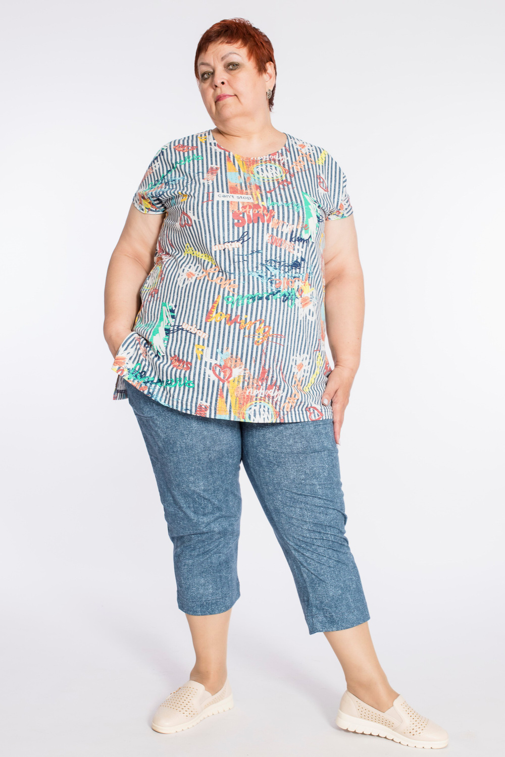 Костюм выполнен из х/б полотна. Футболка с коротким спущенным рукавом, крой прямой, свободный, по бокам разрезы. Горловина имеет круглый вырез. Капри с карманами, по бокам внизу небольшие разрезы.