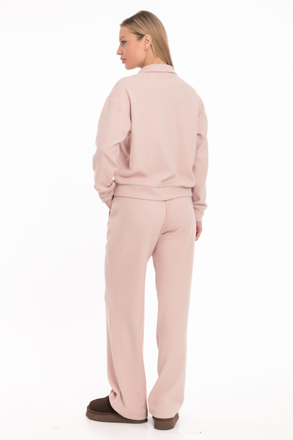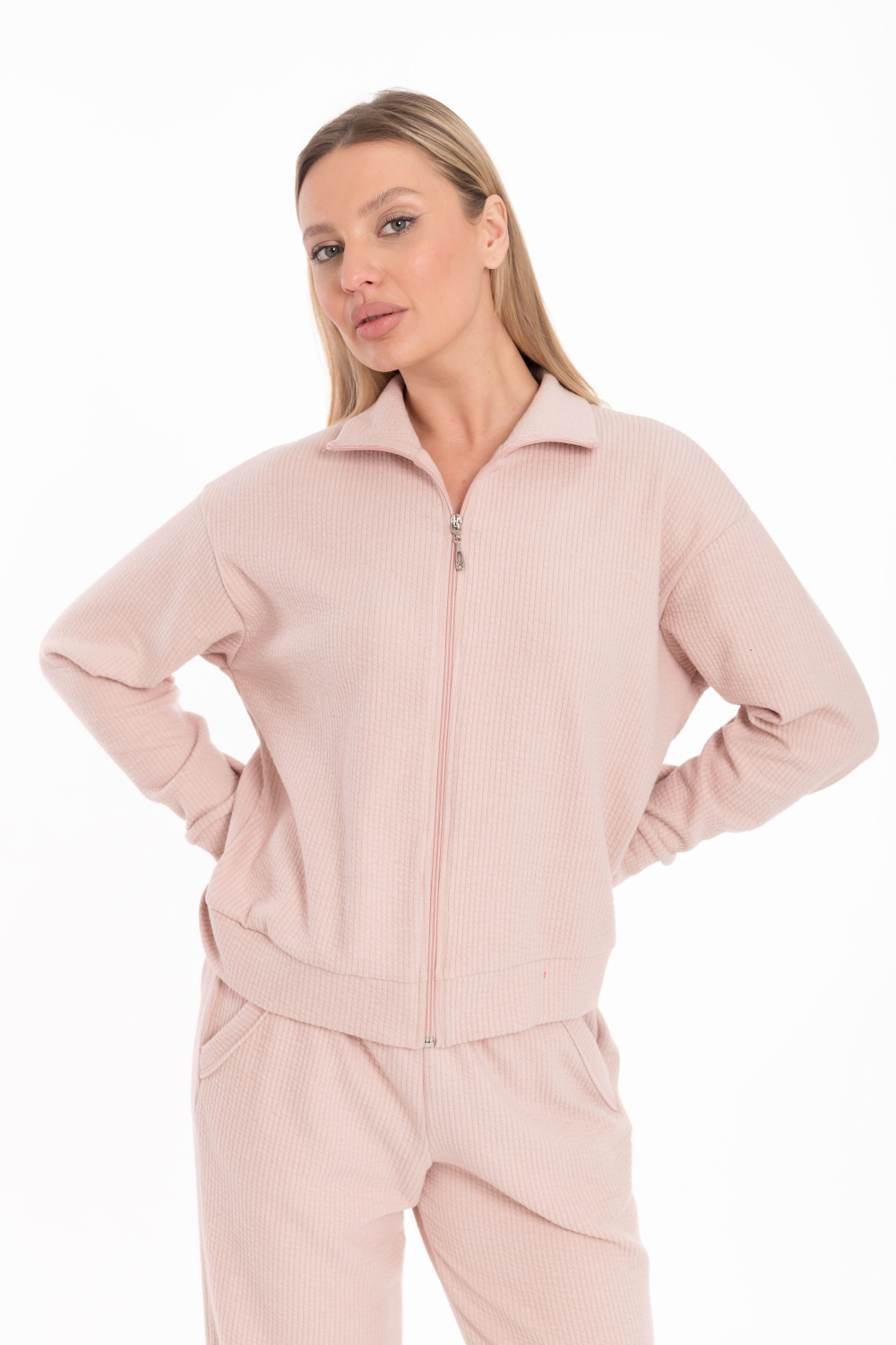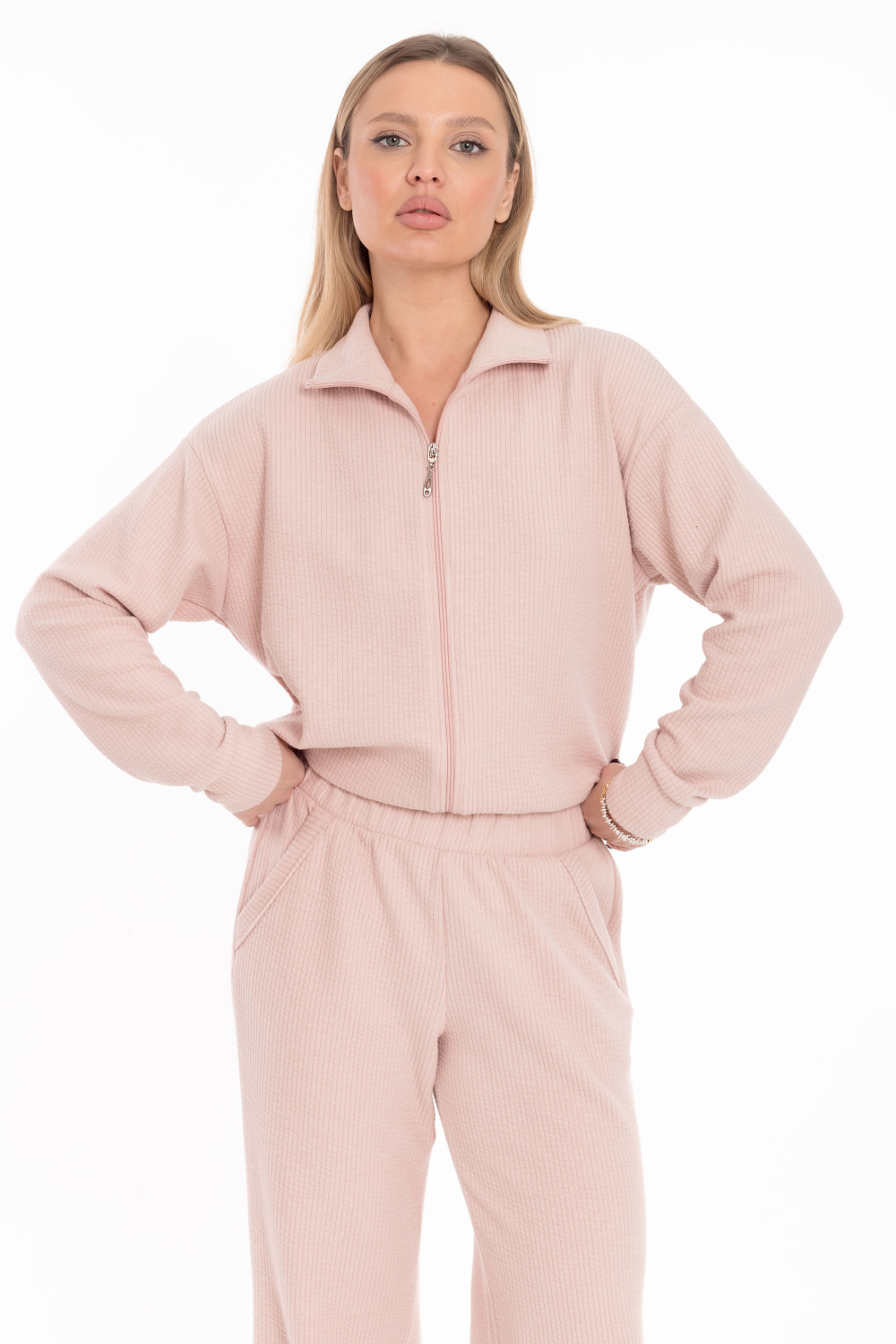 Женский костюм выполнен из плотного и фактурного интерлока с небольшим начесом, который обеспечивает тепло и комфорт. Комплект состоит из практичной толстовки с застёжкой на молнии, длинным спущенным рукавом и уютным воротником-стойкой, а также элегантных свободных брюк с удобными боковыми карманами и поясом на резинке. Этот универсальный ансамбль идеально подходит для прогулок, отдыха дома и создания стильного повседневного образа в прохладную погоду.