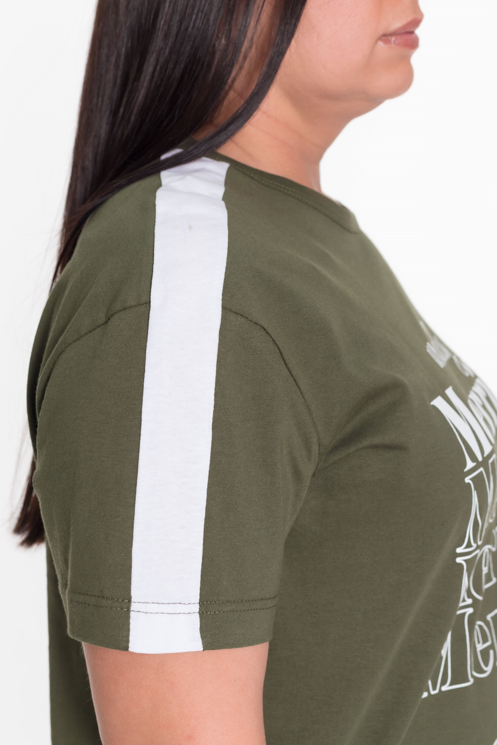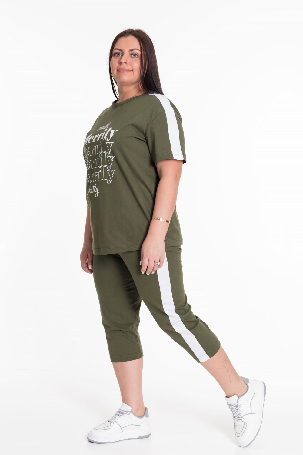 По плечам и рукаву футболки, по бокам капри лампасы контрастного цвета.