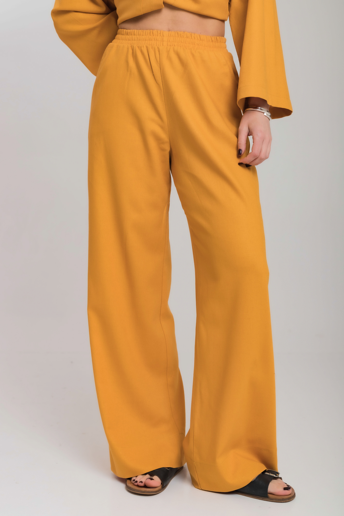 Костюм свободного силуэта сшит изо льна с вискозой.