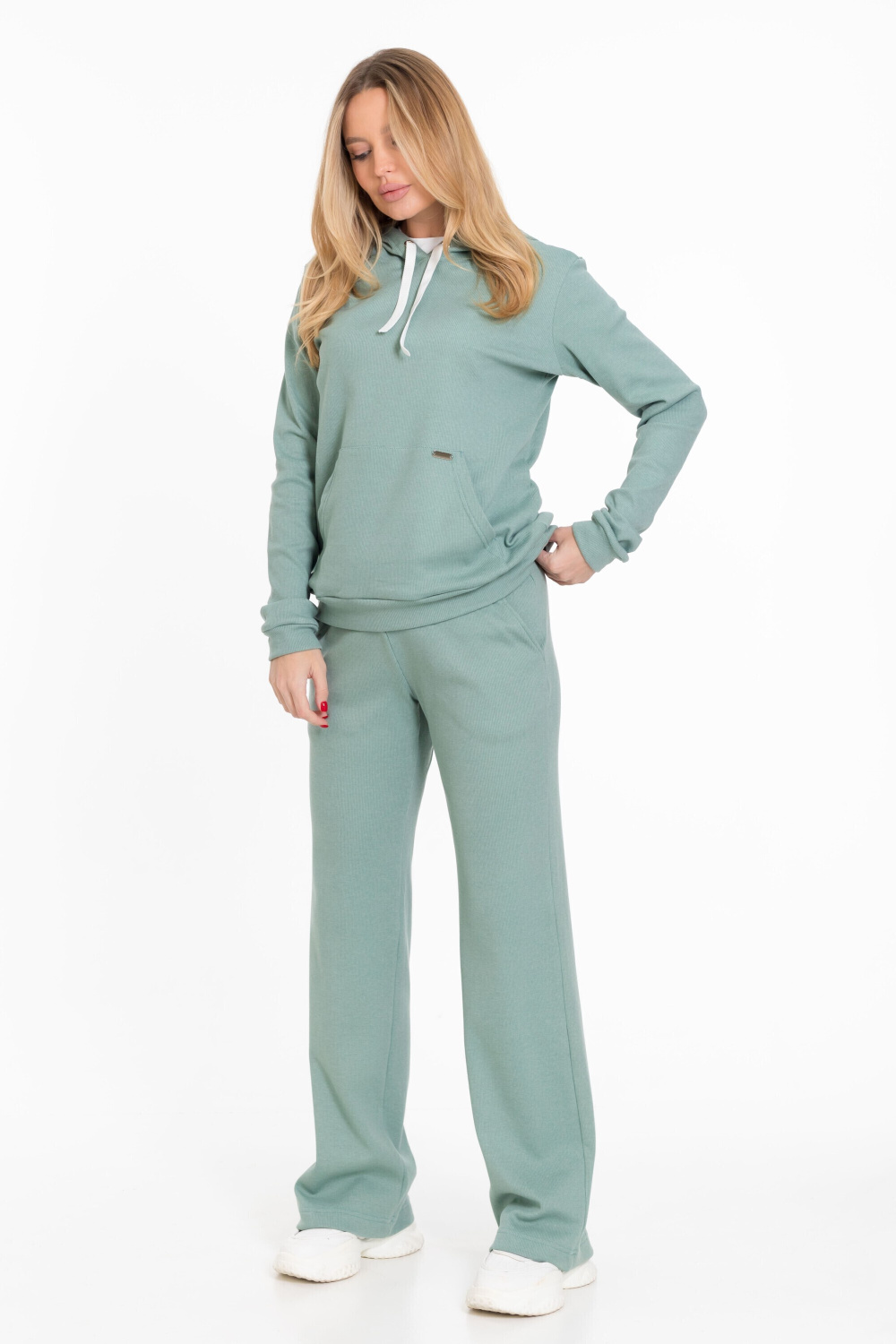 Женский костюм из однотонного кашкорсе цвета ментол с начесом представляет собой уютный и стильный комплект, состоящий из брюк и толстовки.