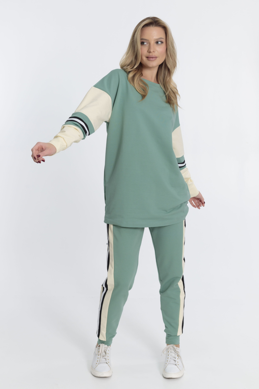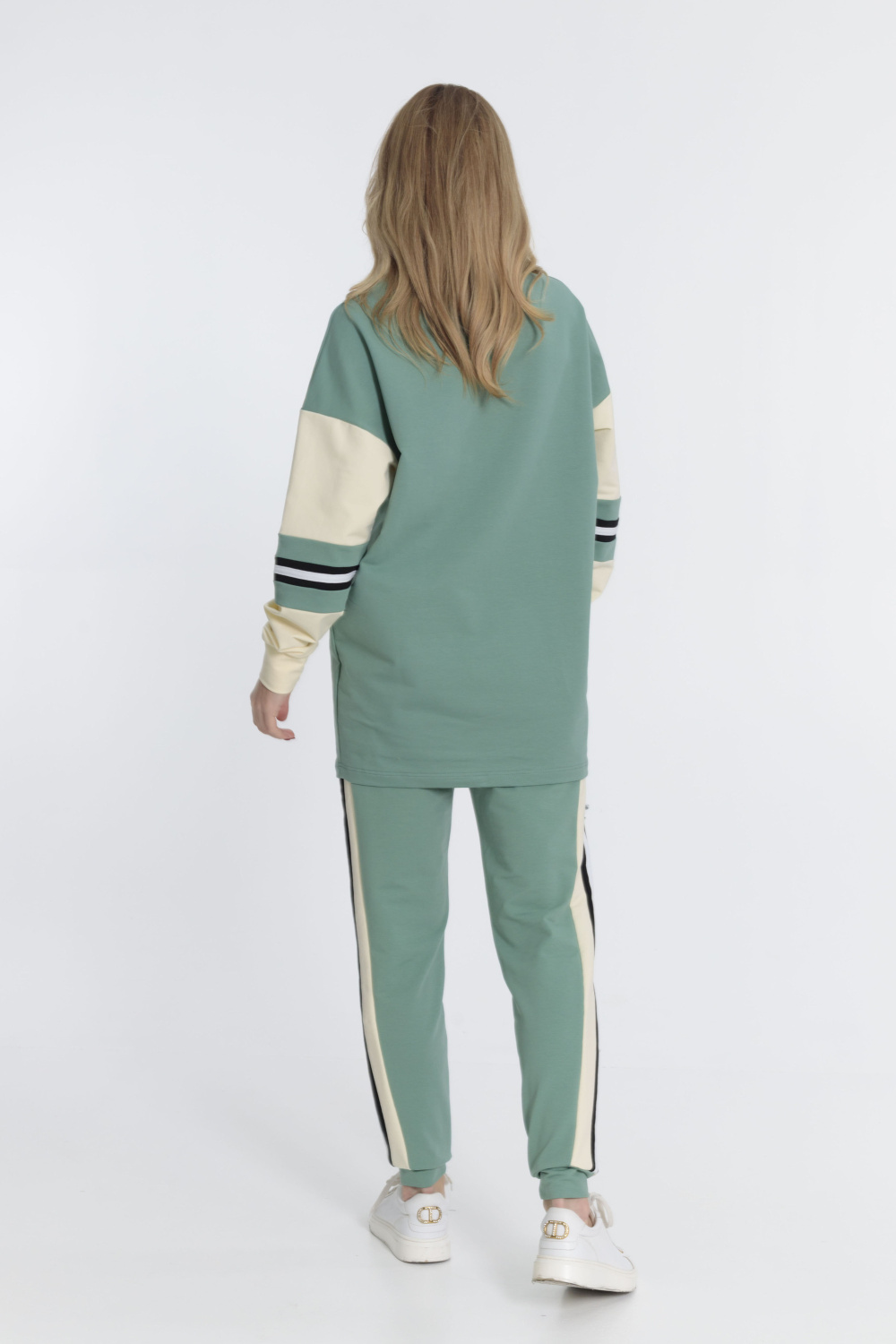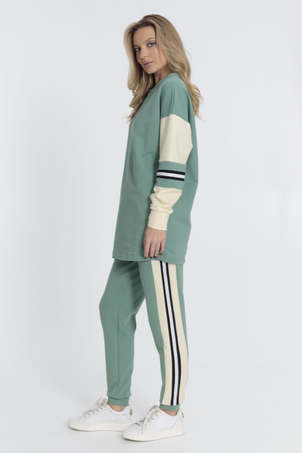 Костюм выполнен из футер петли с лайкрой. Толстовка свободная, удлинённого силуэта, линия плеча спущена. Длинные рукава заканчиваются манжетами, круглый вырез горловины оформлен планкой. Брюки с притачным поясом, манжетами и боковыми карманами. На рукавах толстовки и на брюках отделочные полосы с лампасами.